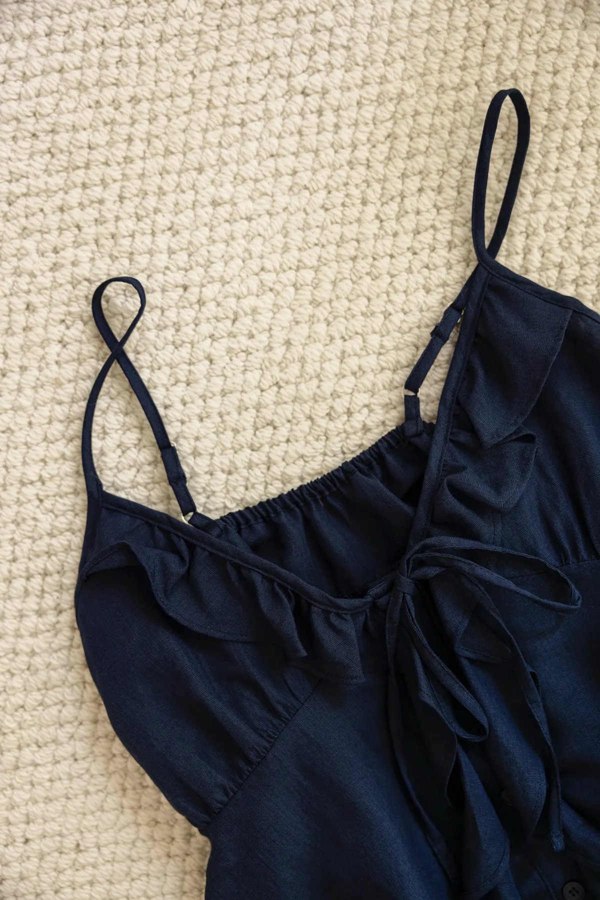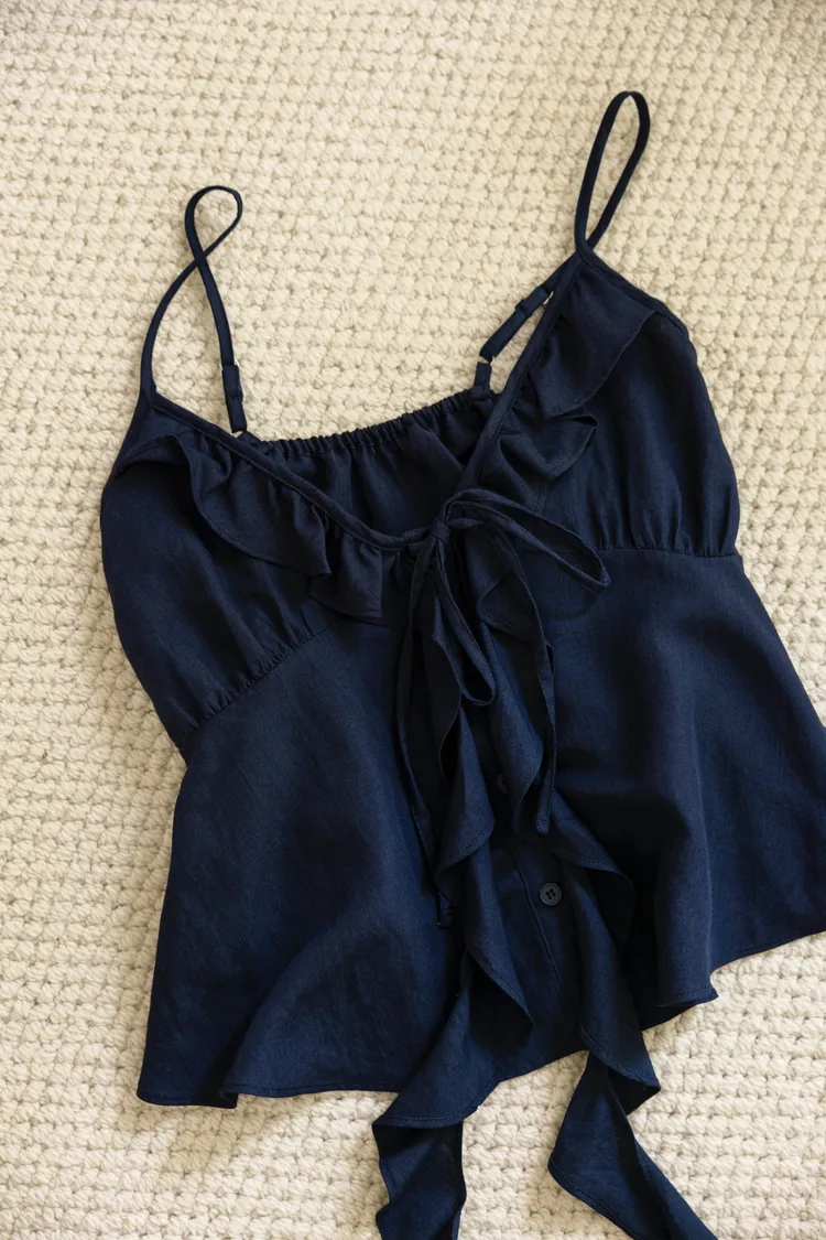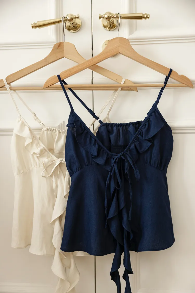 高級棉麻捲捲垂邊傘狀細肩帶上衣(兩色)