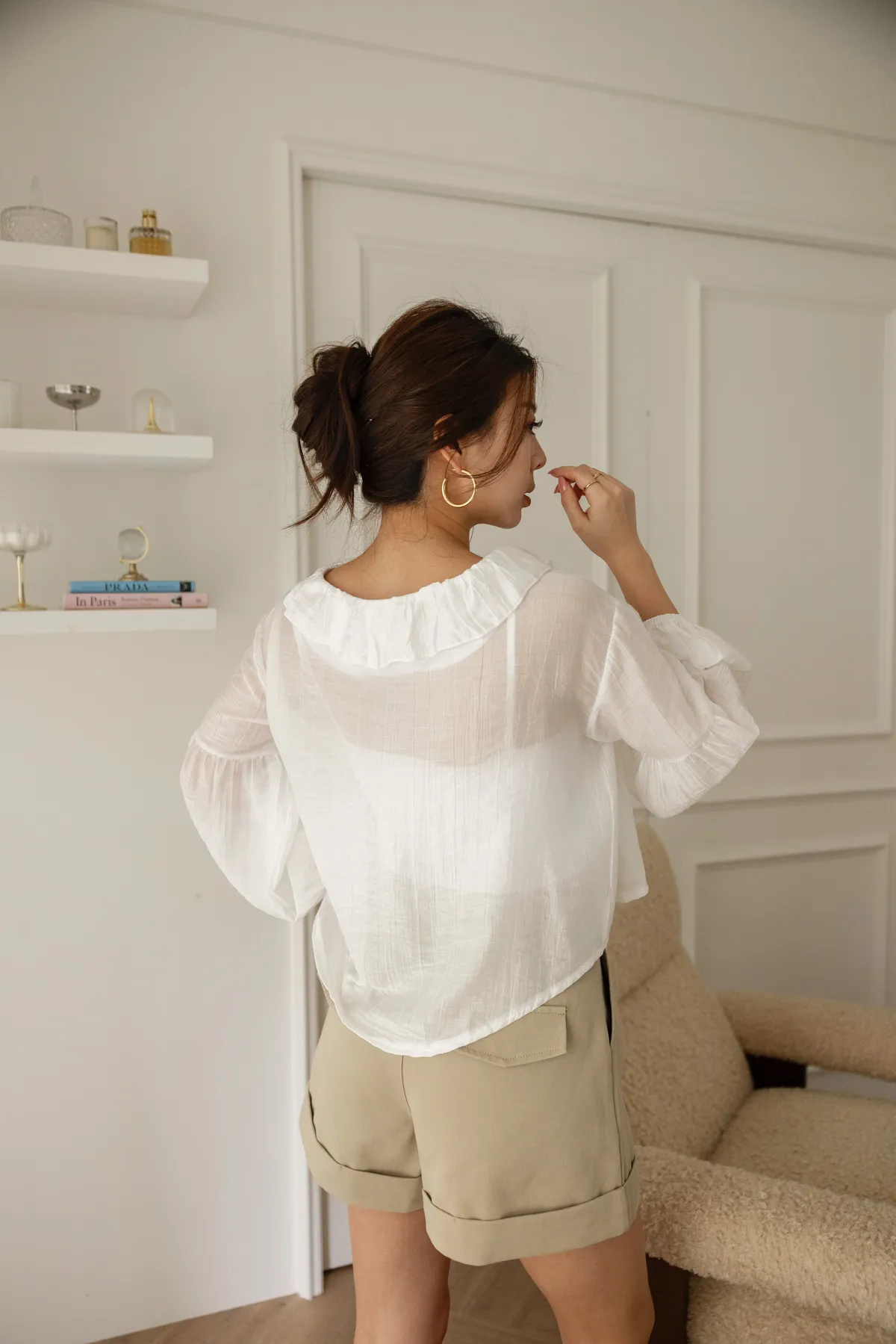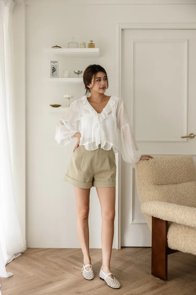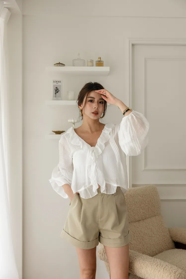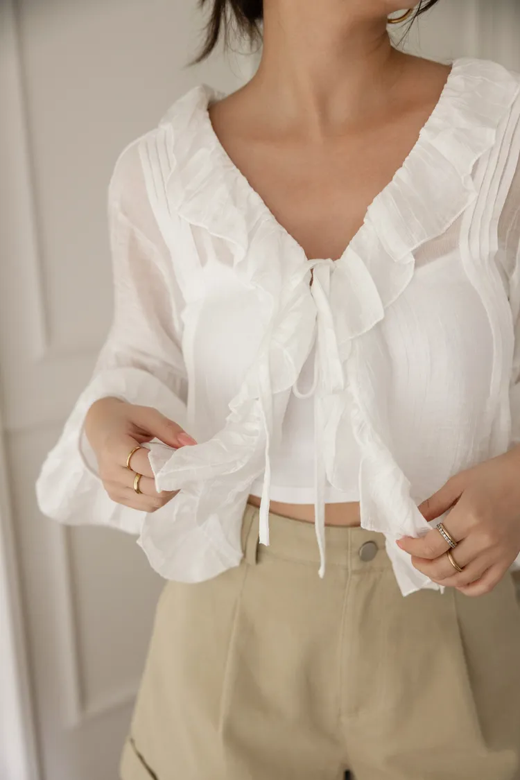 澎澎袖荷葉滾邊透膚小罩衫(白)