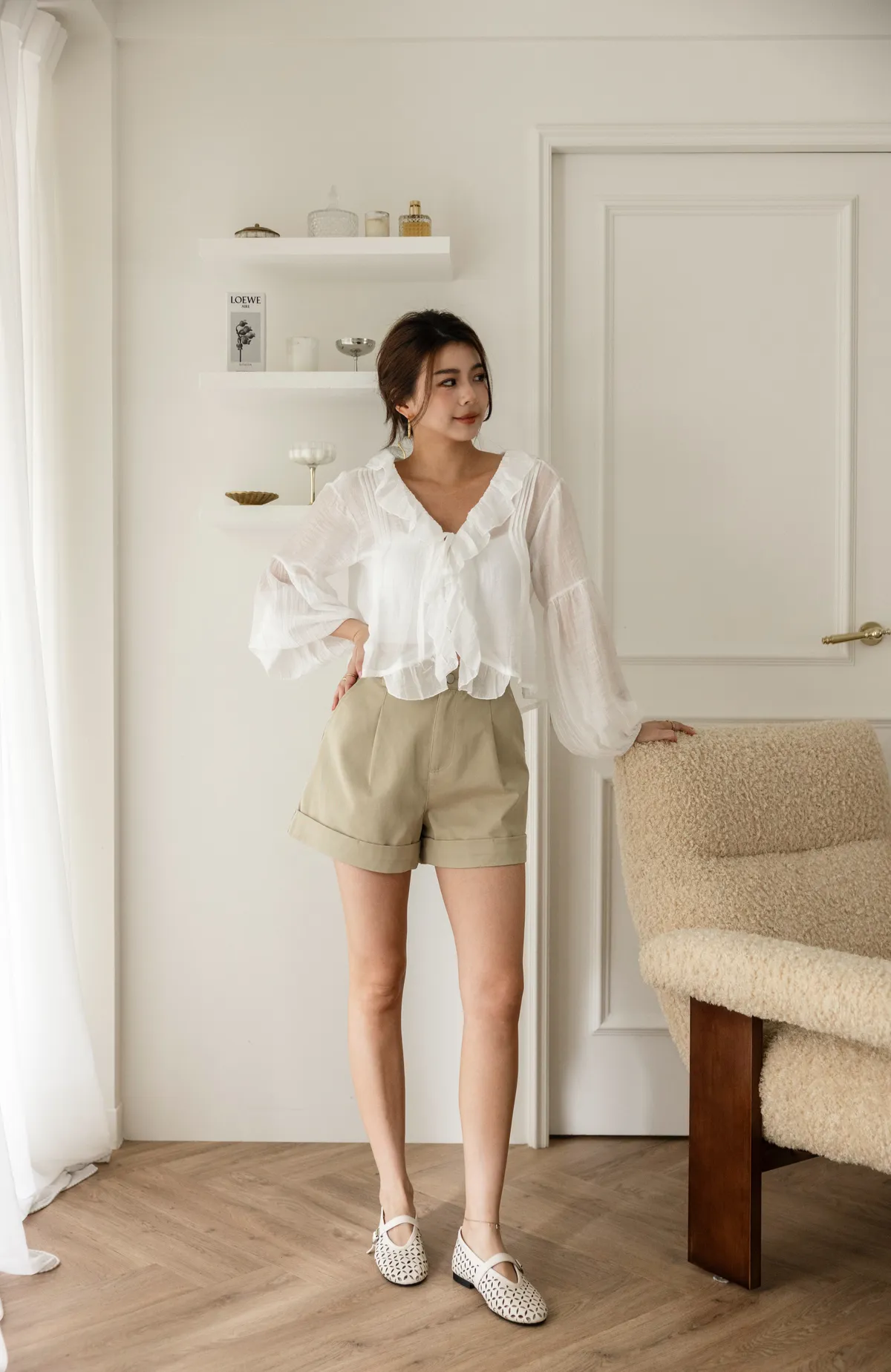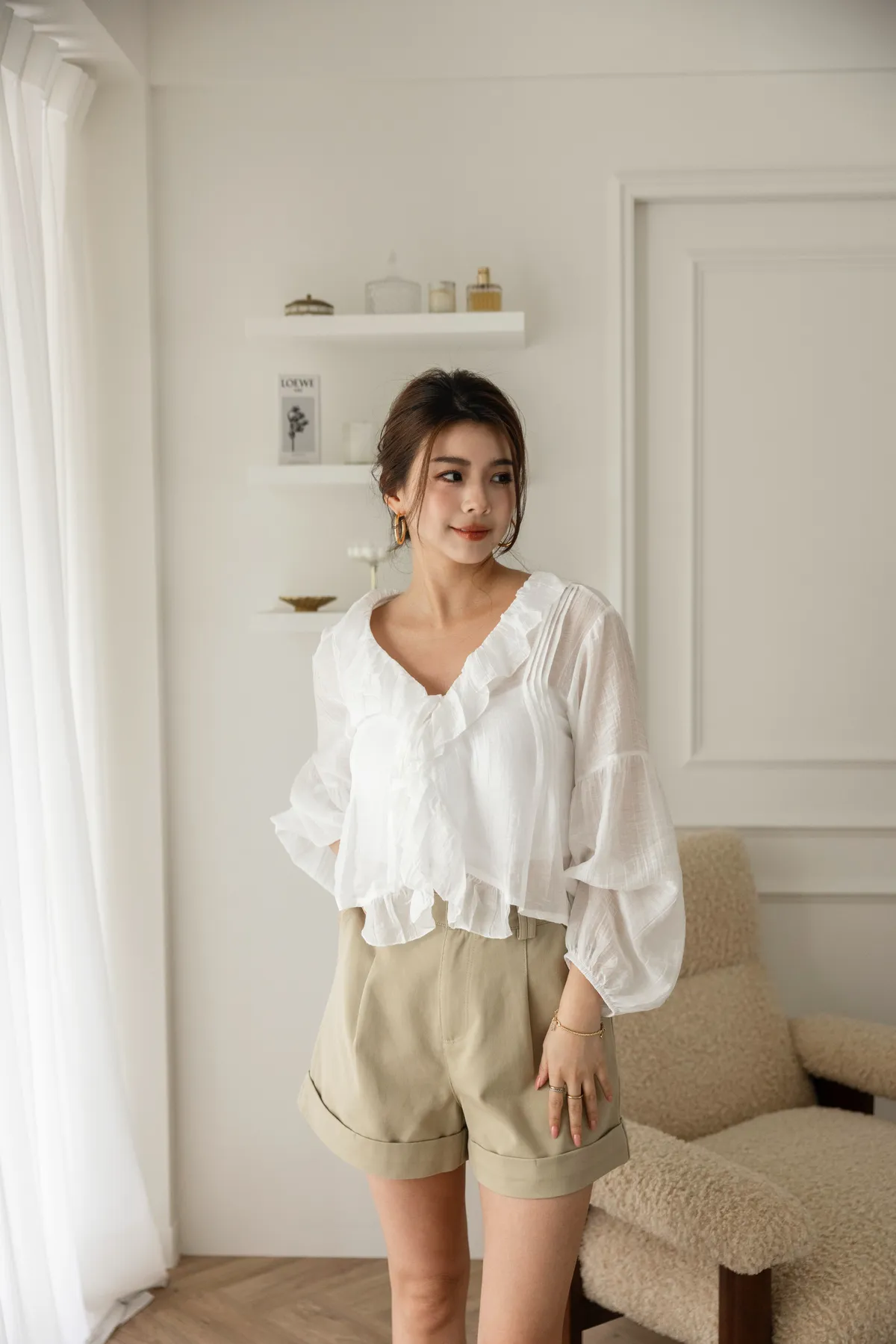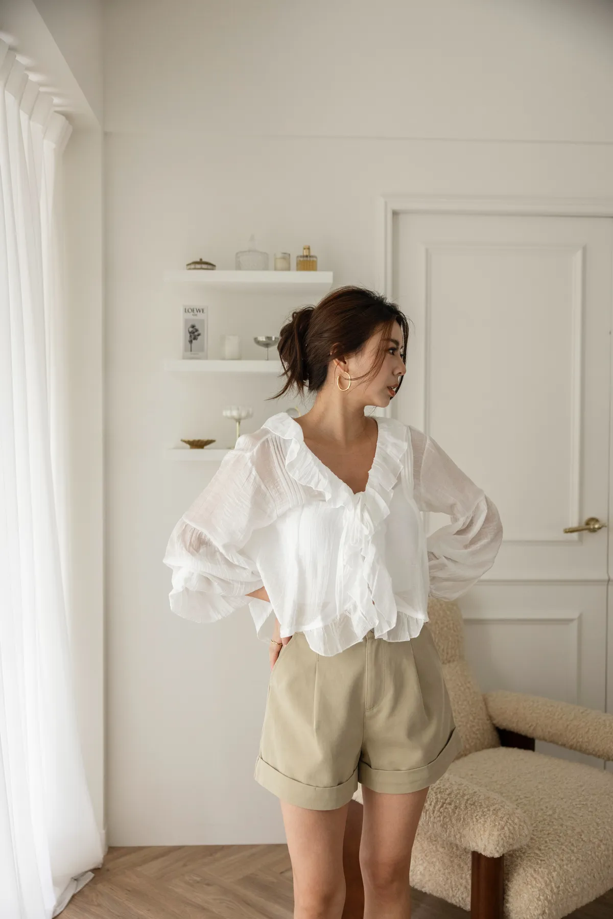 澎澎袖荷葉滾邊透膚小罩衫(白)