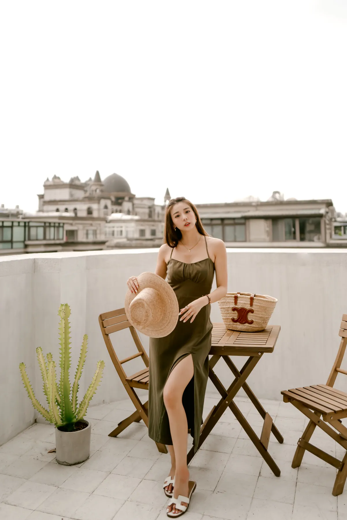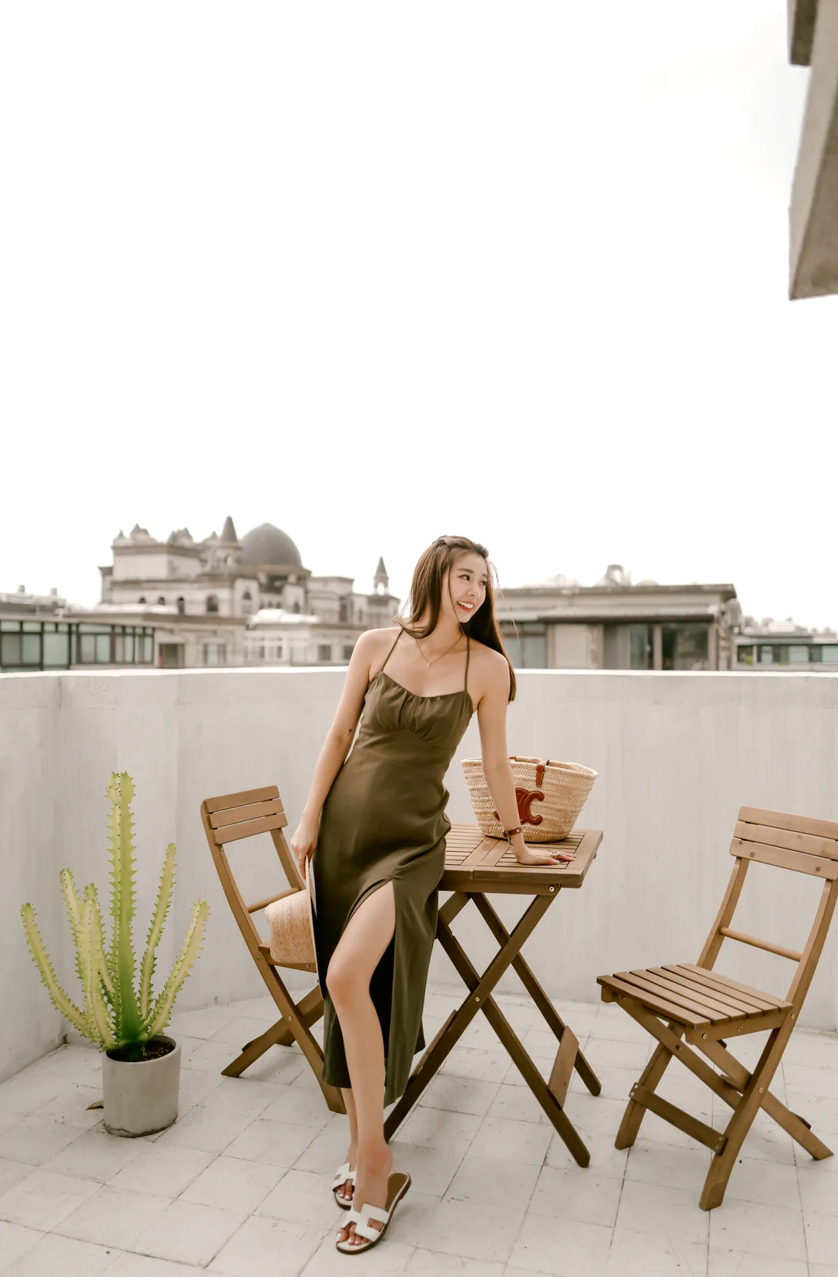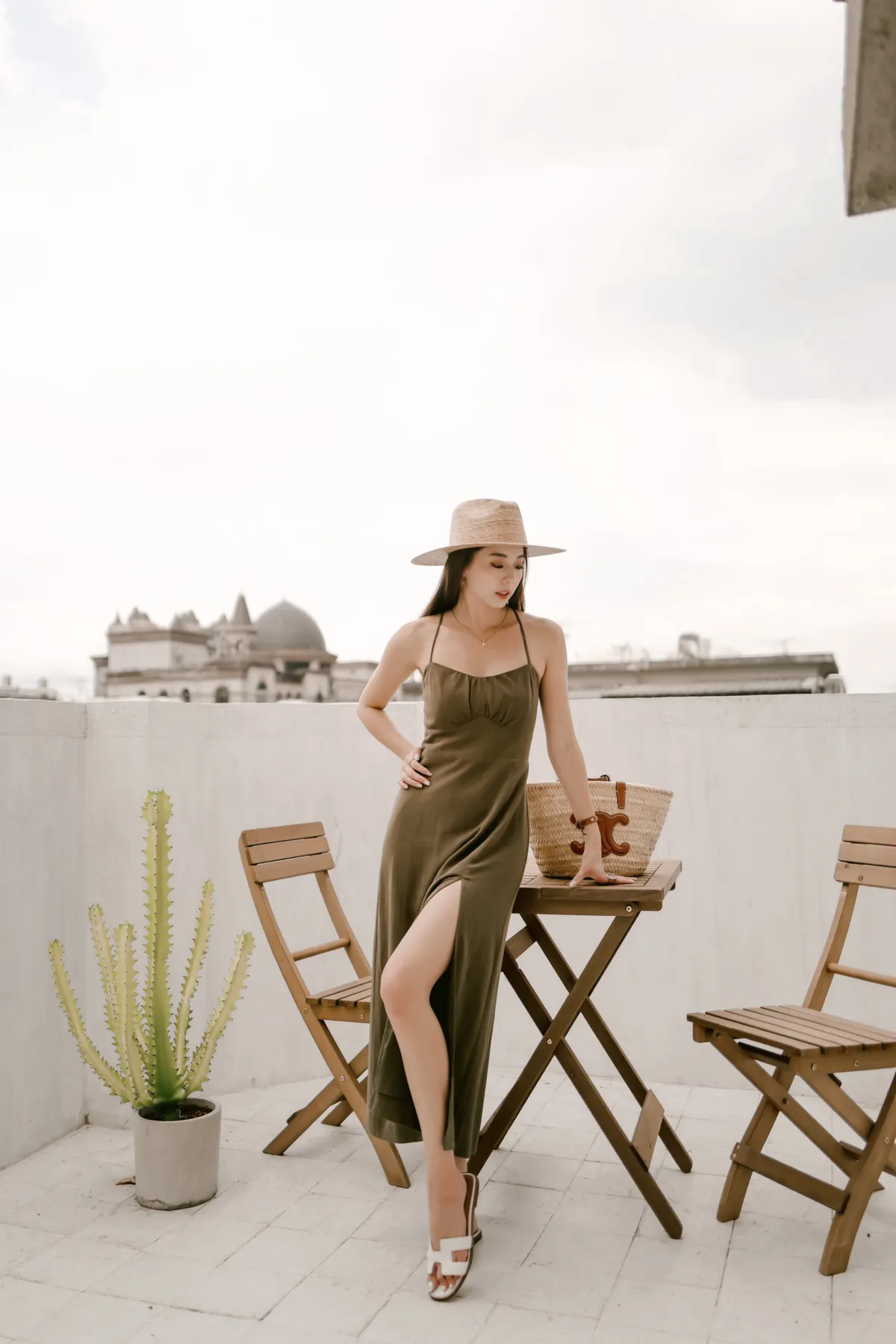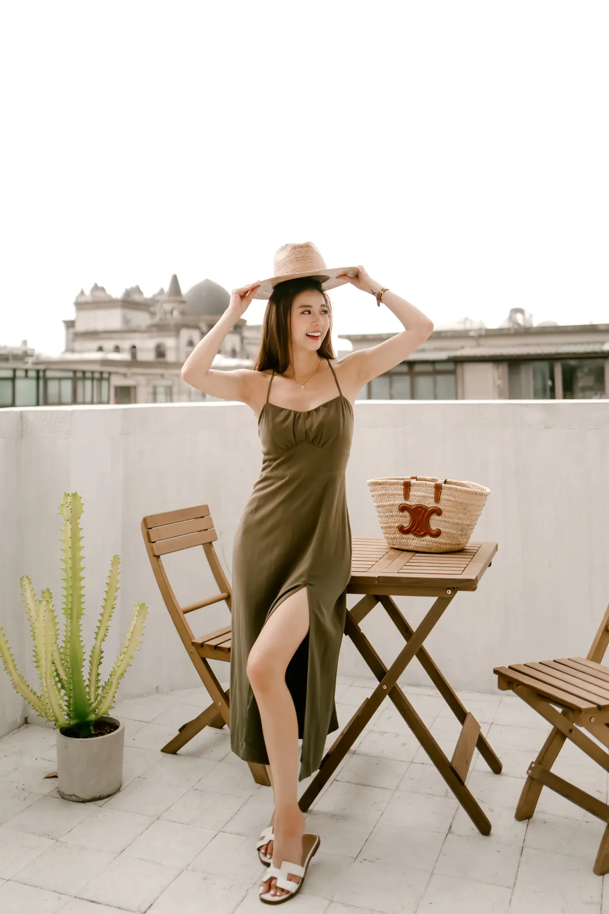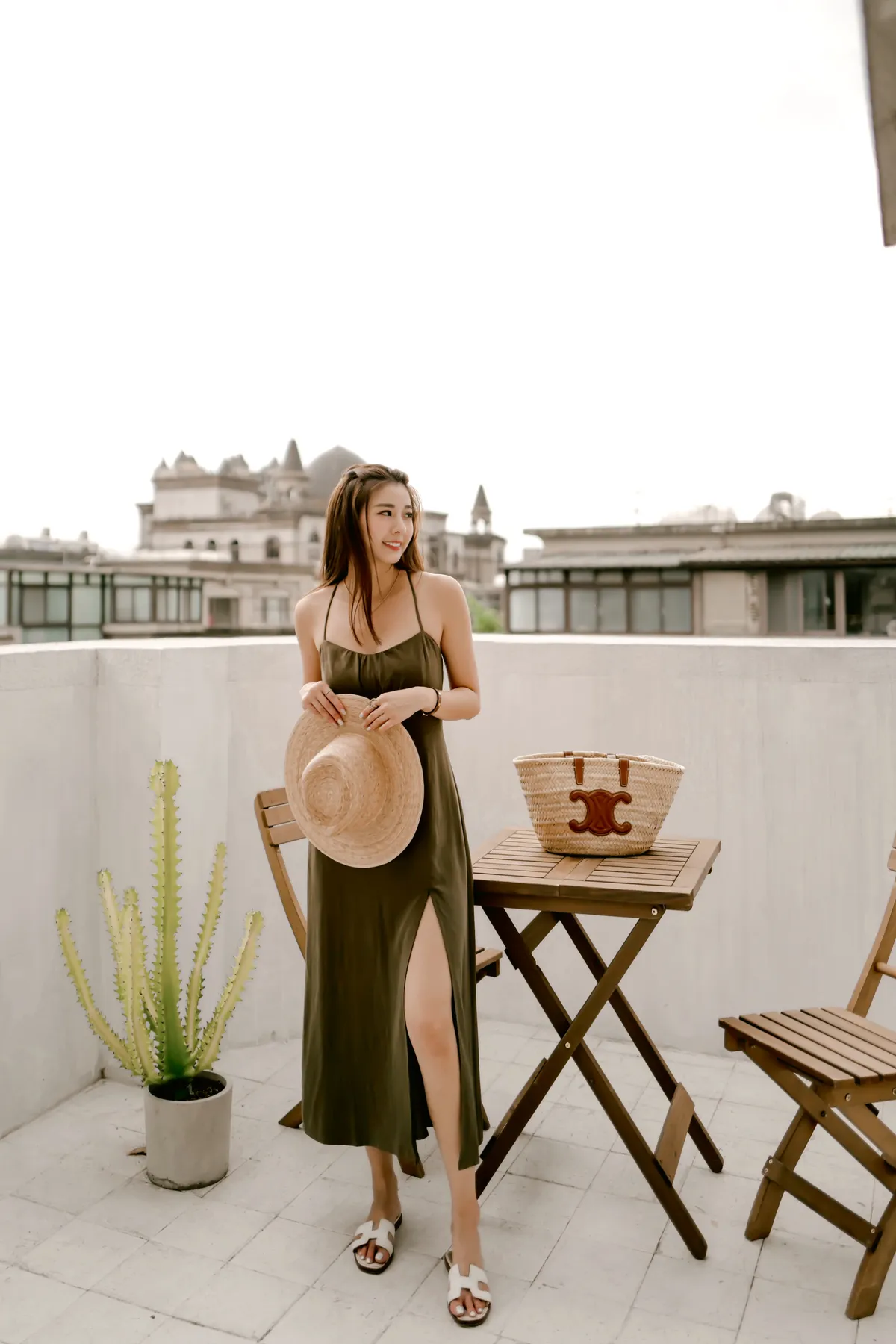 訂製系列「美背開杈棉麻洋裝」(墨綠)(現貨)
