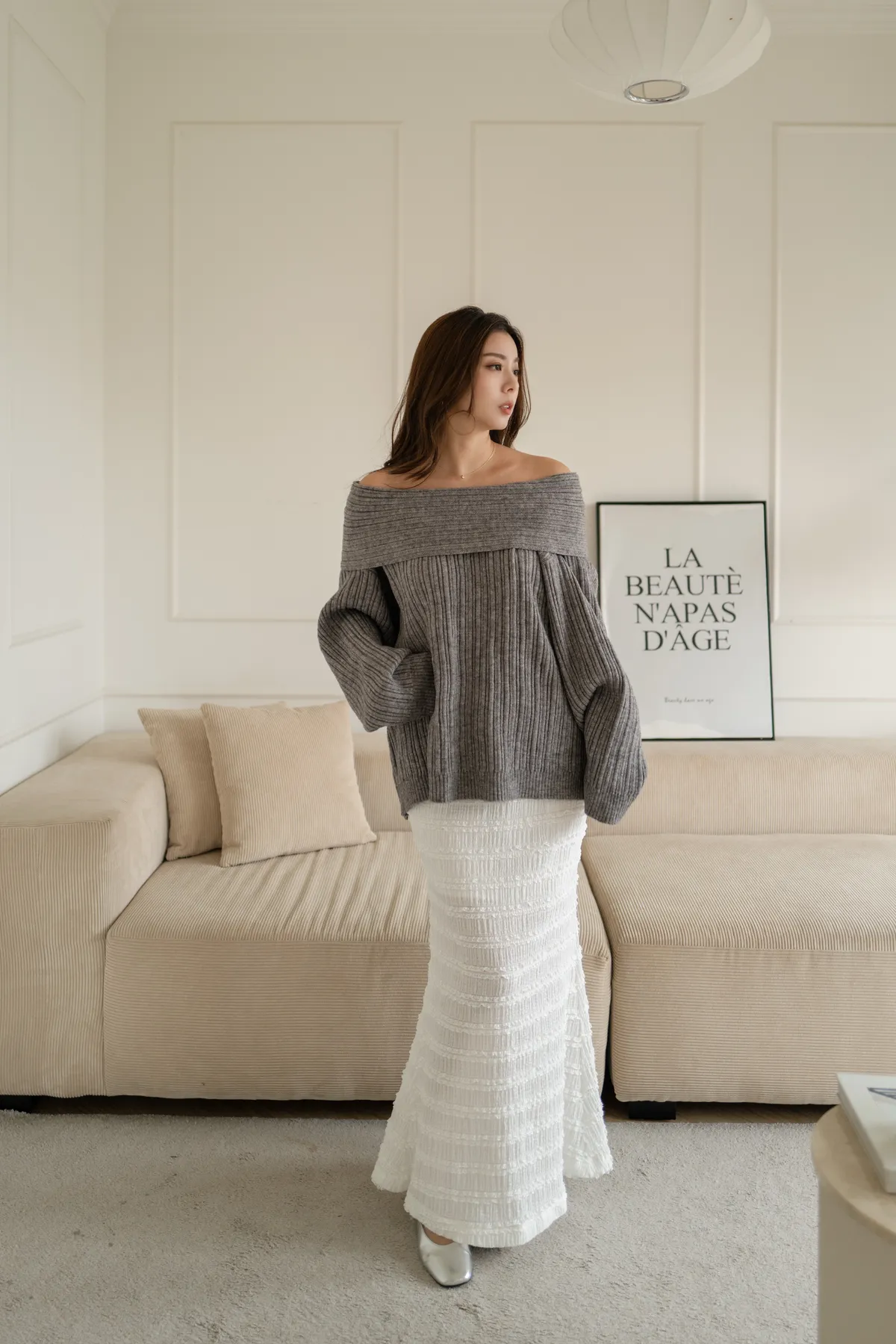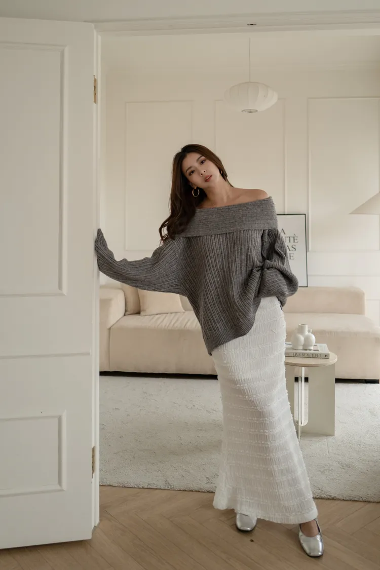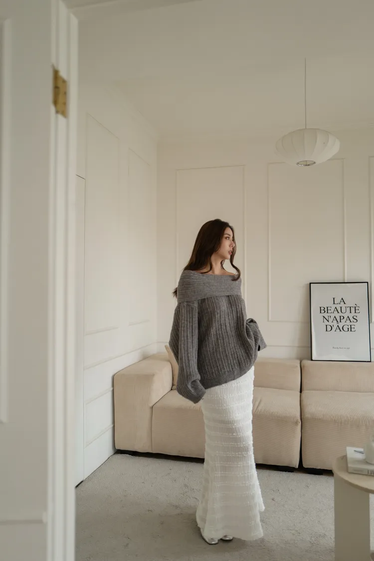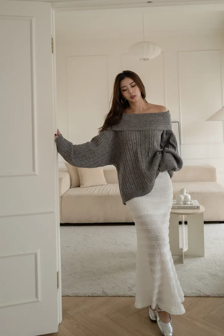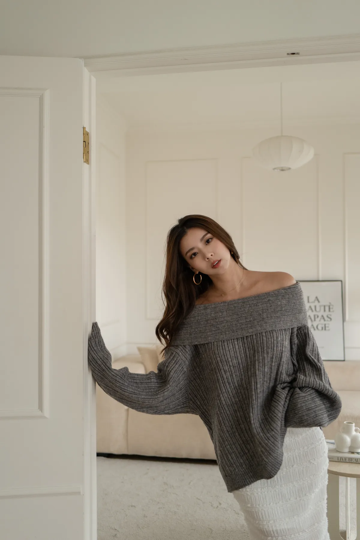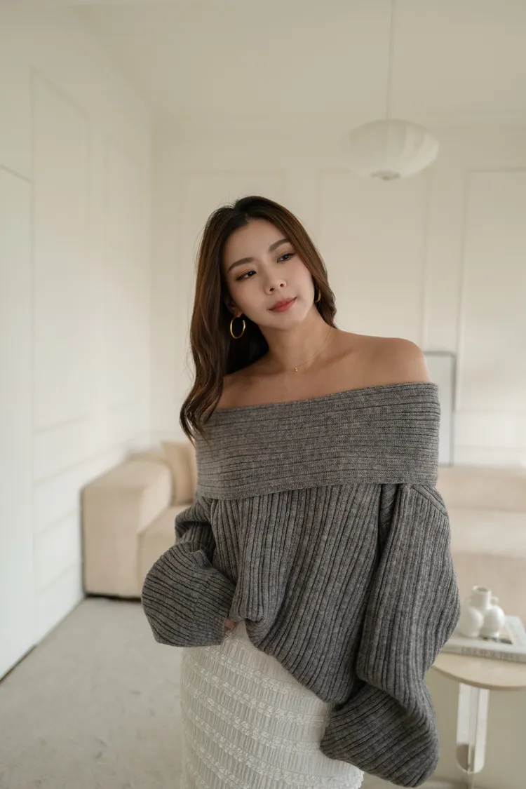 漂亮氣質翻領露肩長版針織上衣(灰)