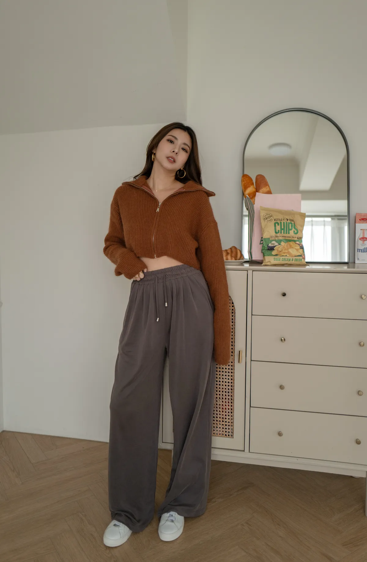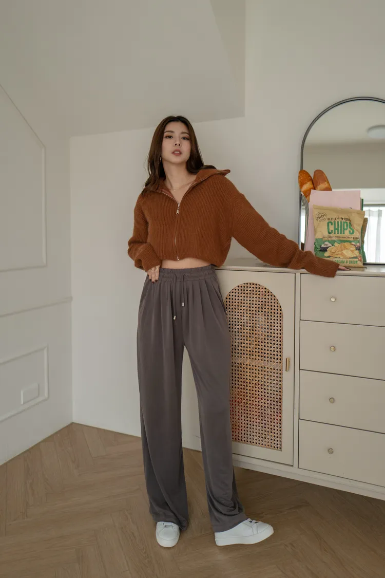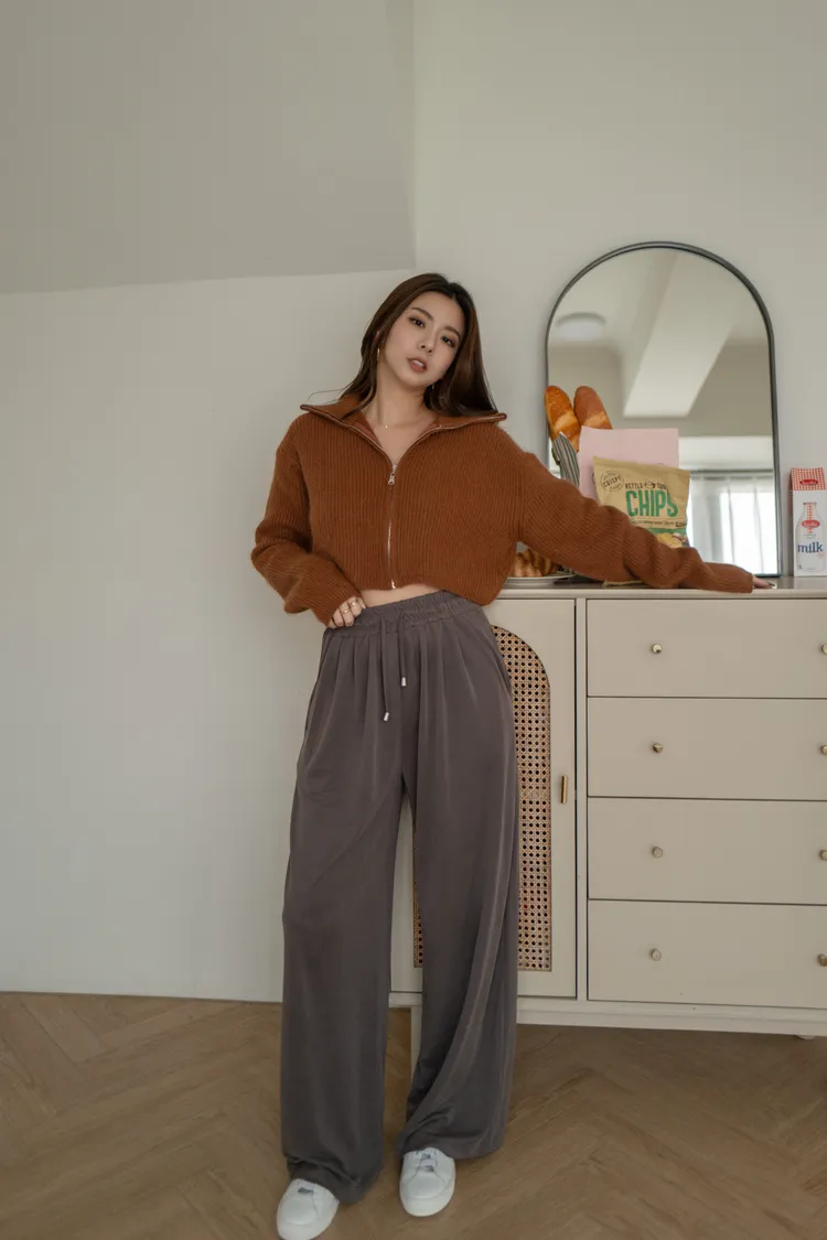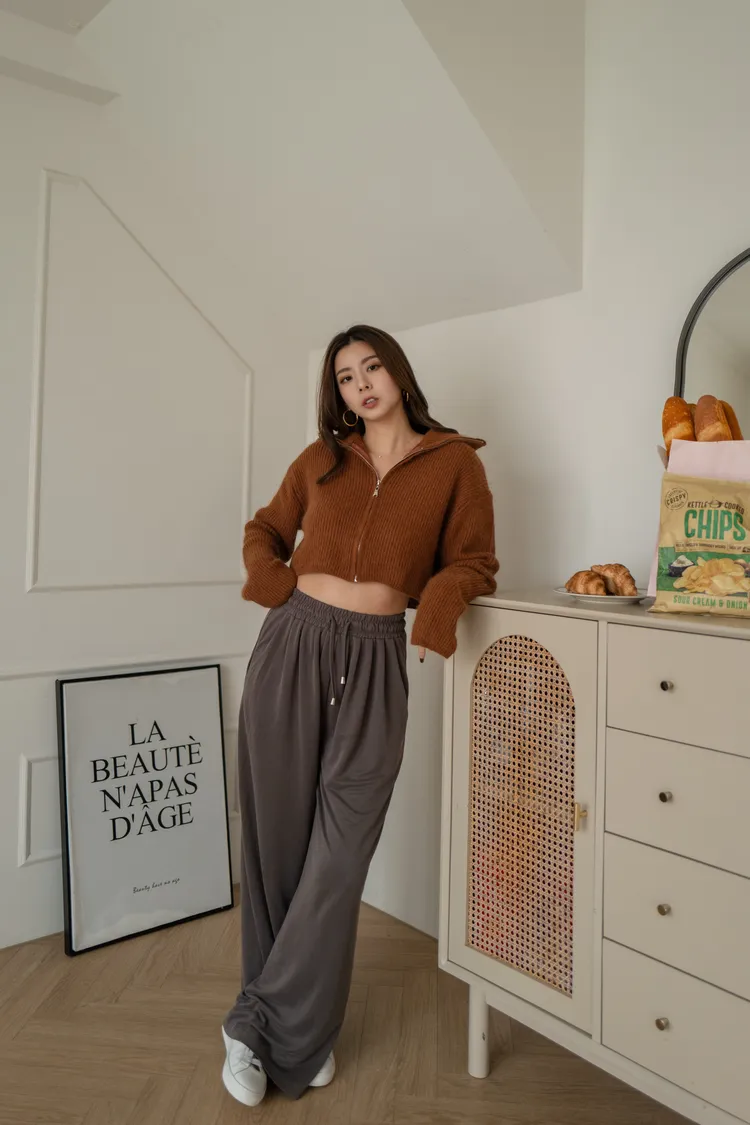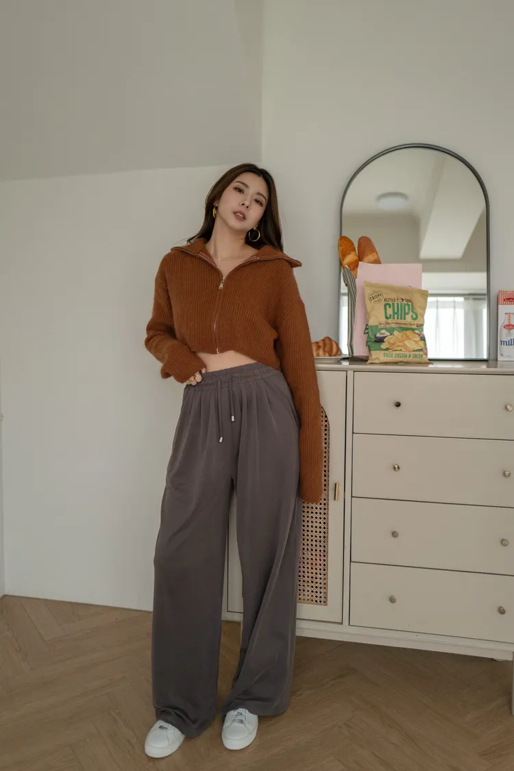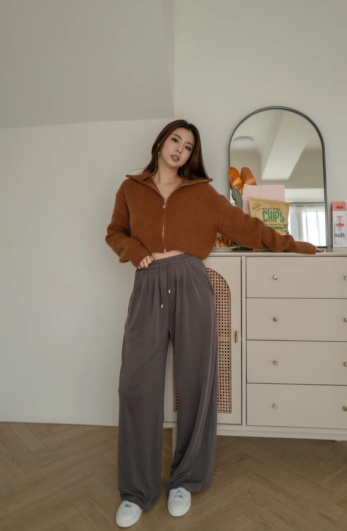 薄絨料光澤感超舒服落地寬褲(灰咖)