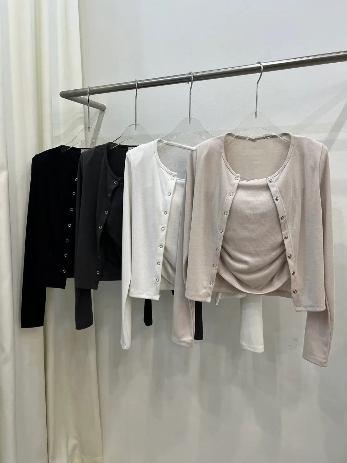 棉質排扣外罩衫+細肩帶側抓皺BraTop兩件Set(多色)