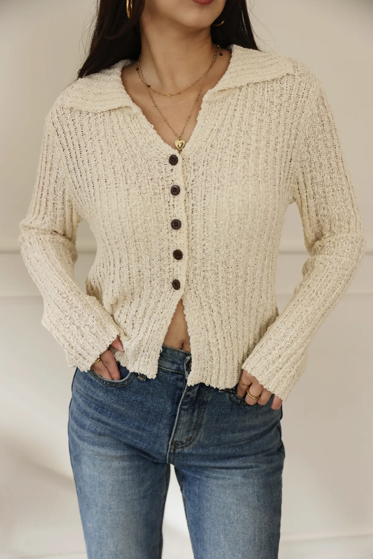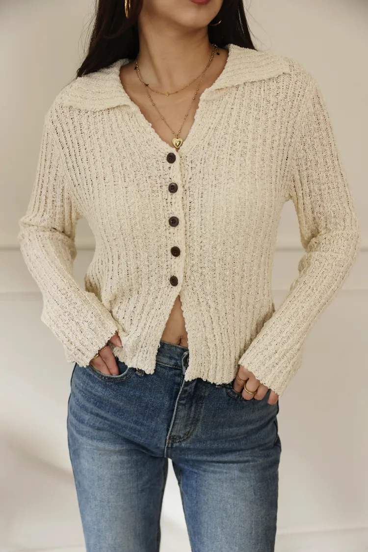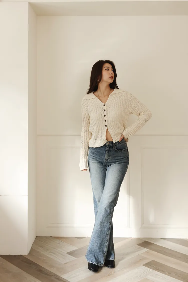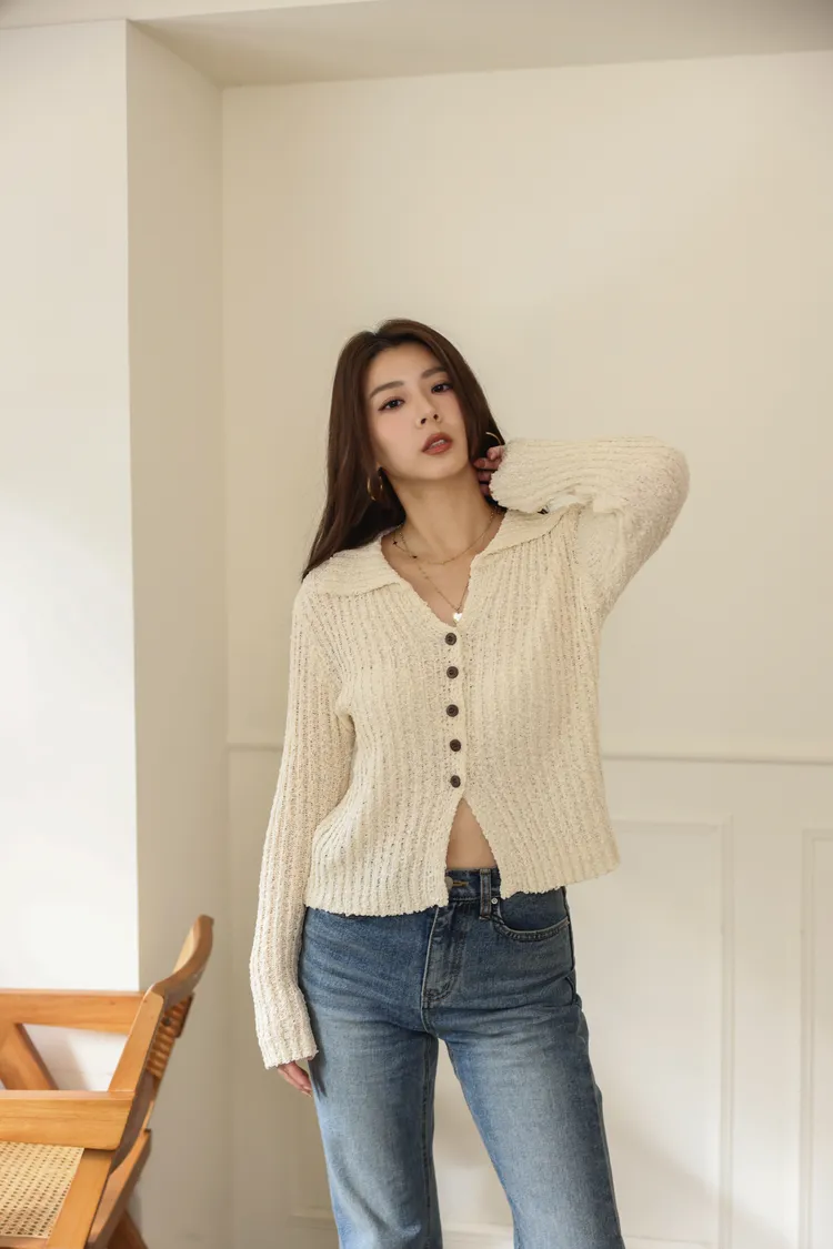 歐美感翻領下擺開叉設計混色薄料針織(杏)