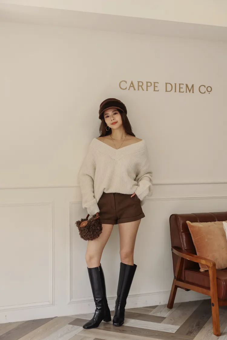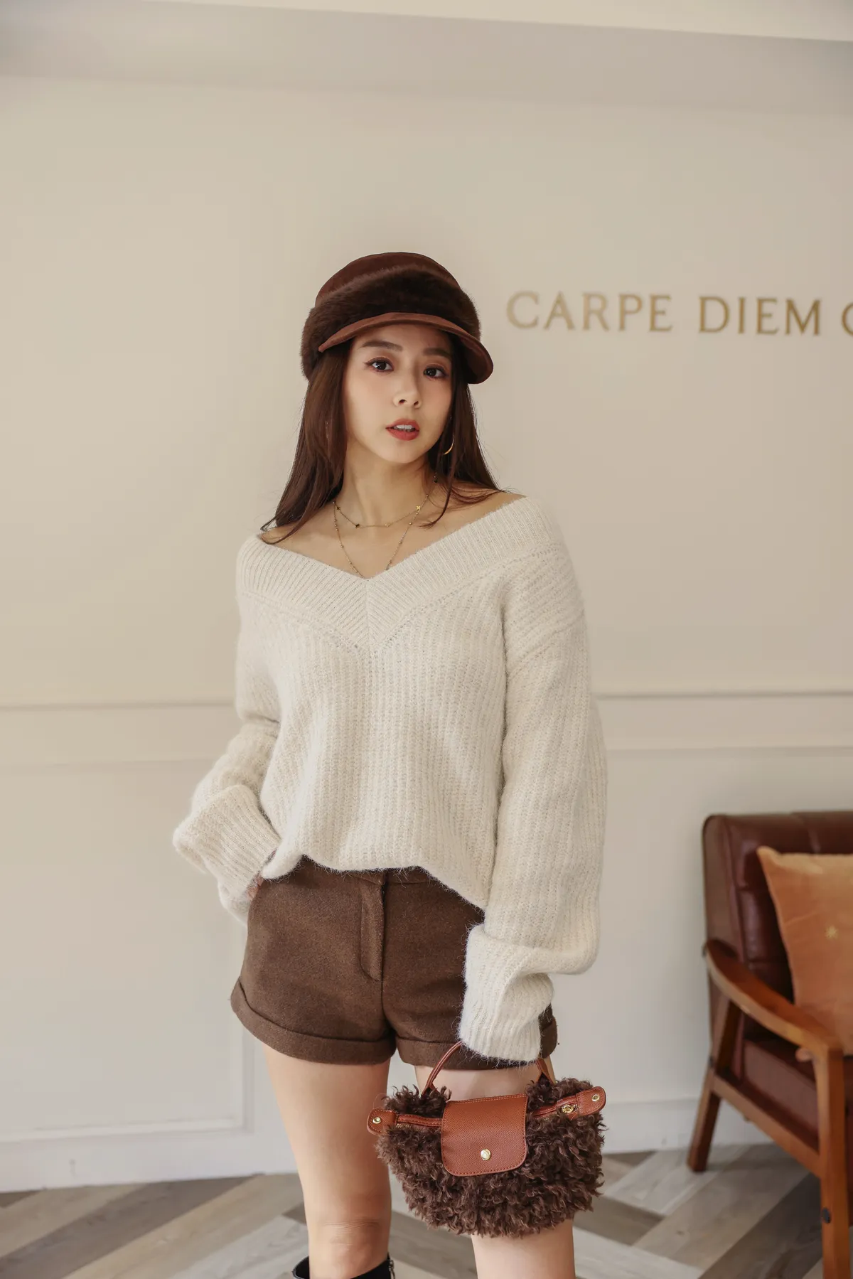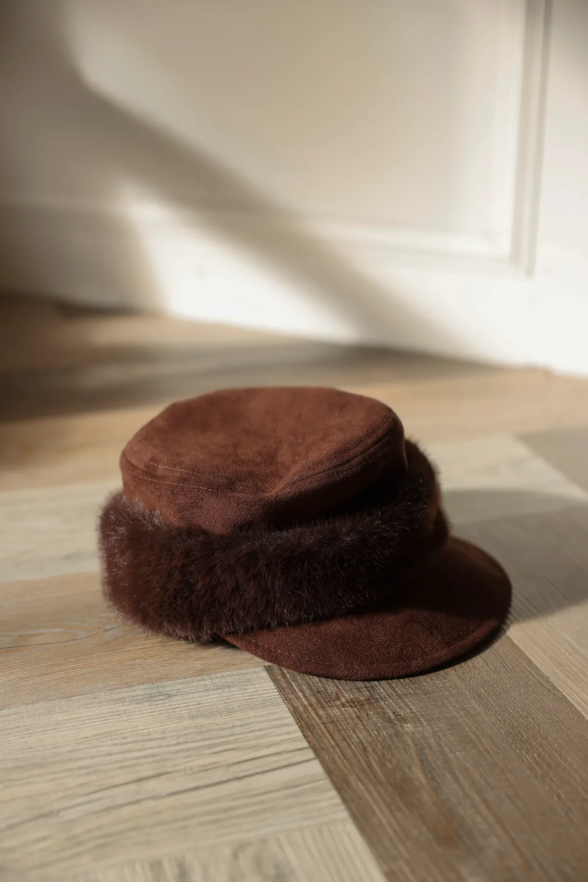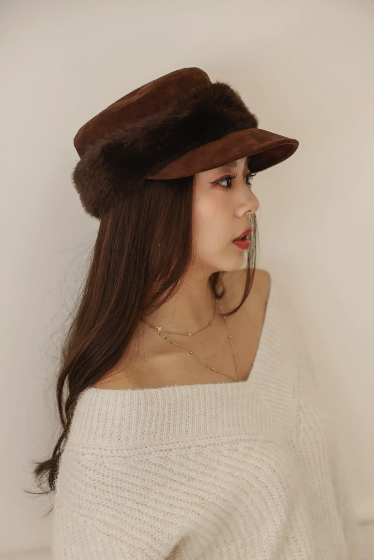 麂皮鑲柔軟毛毛可調節帽子(咖)