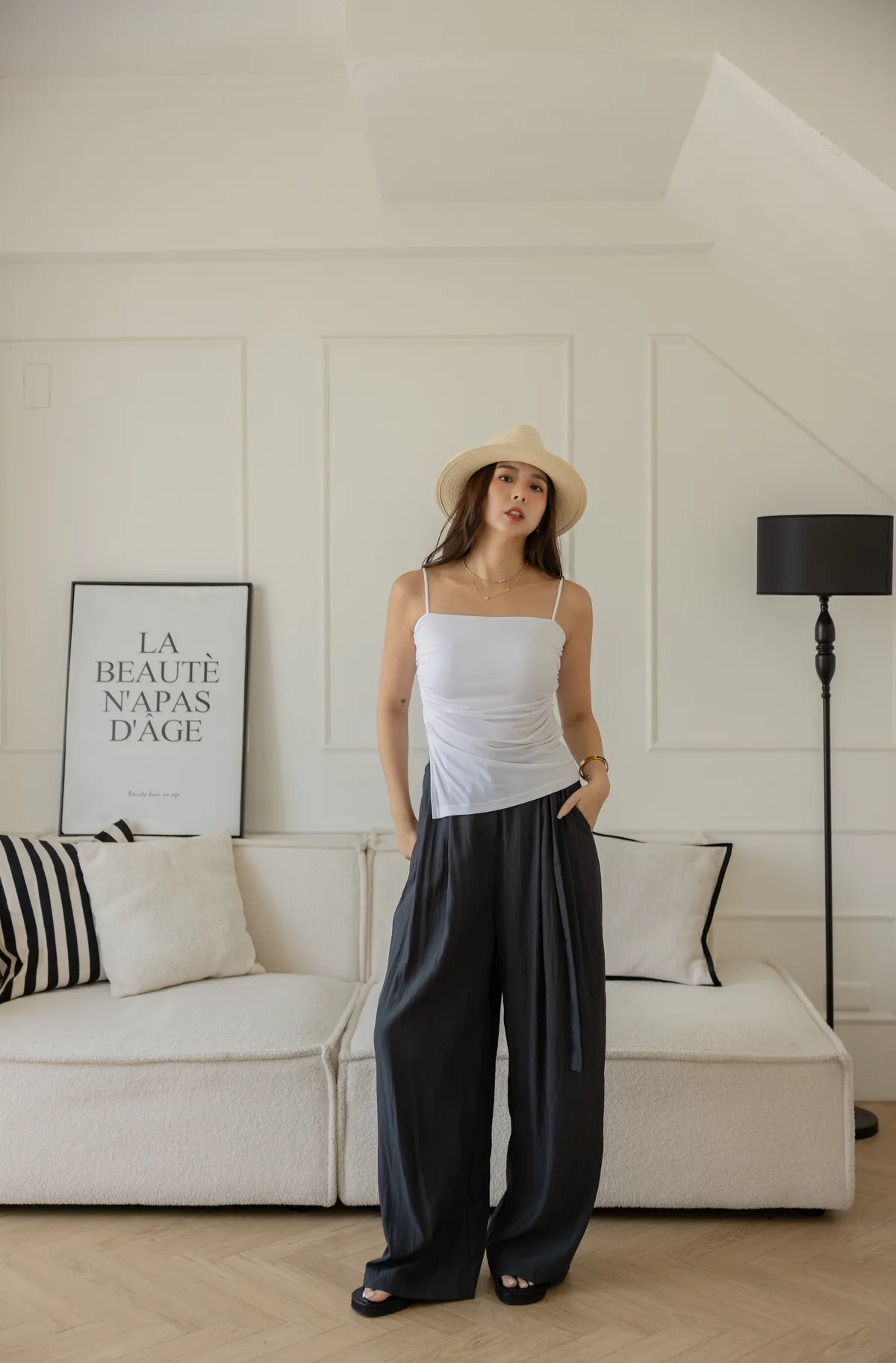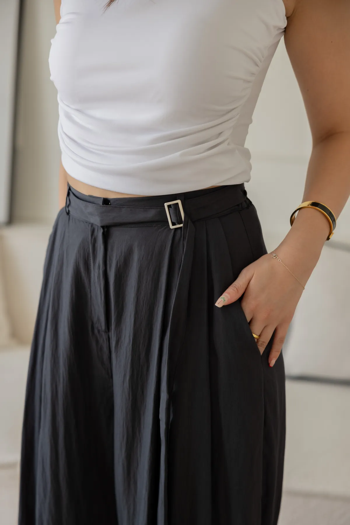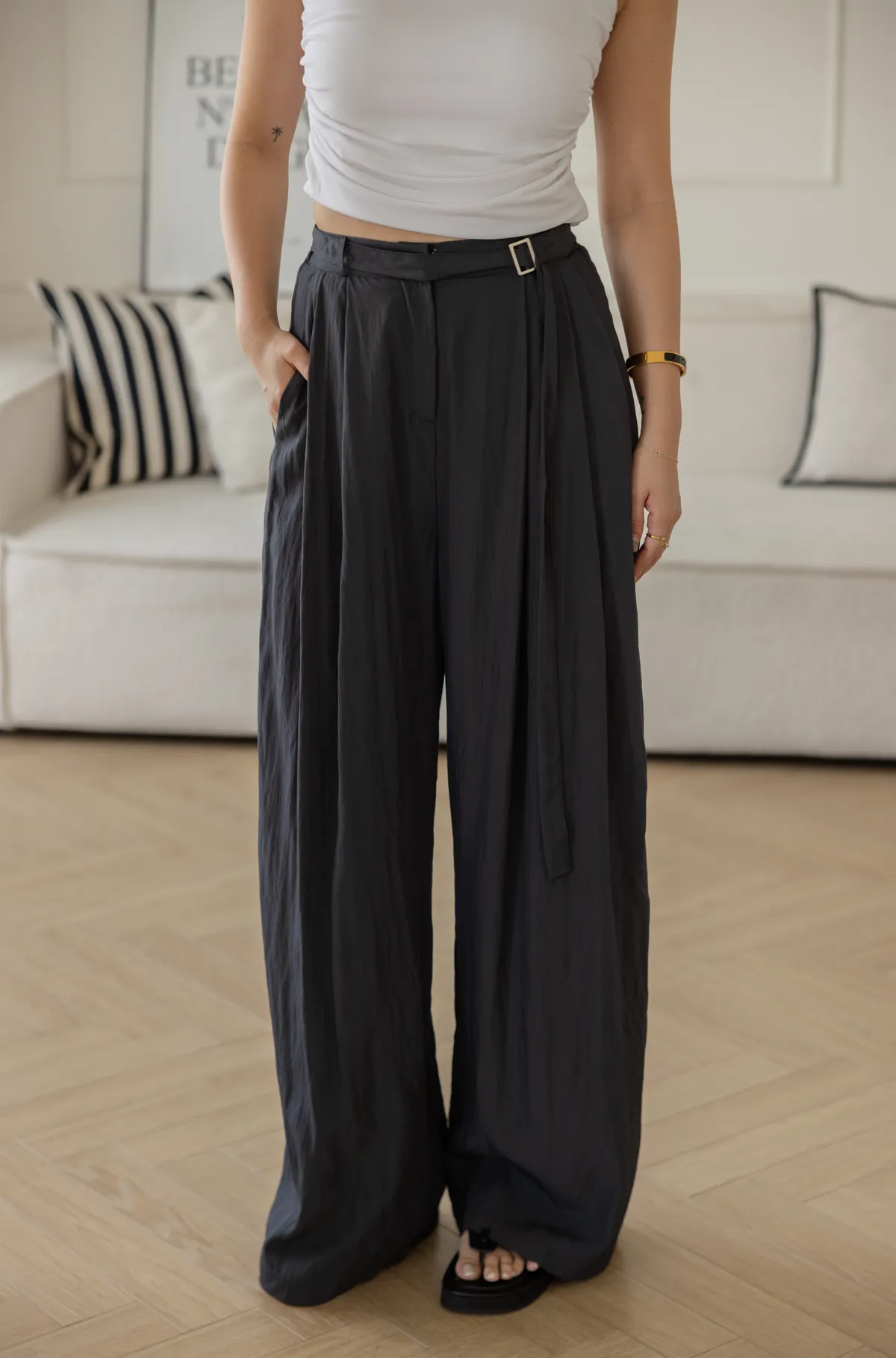 高級剪裁摺線修飾涼感落地舒服腰帶寬褲(深灰藍)