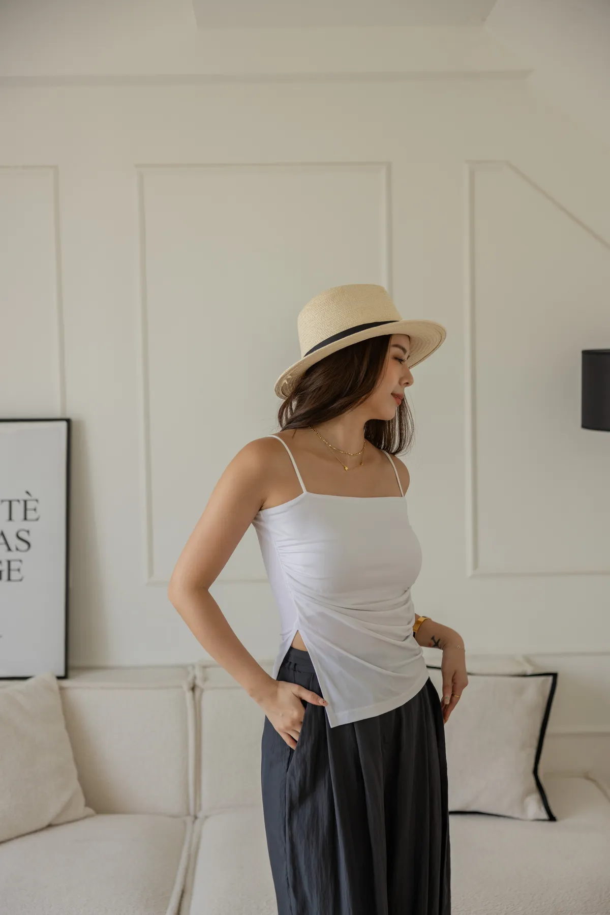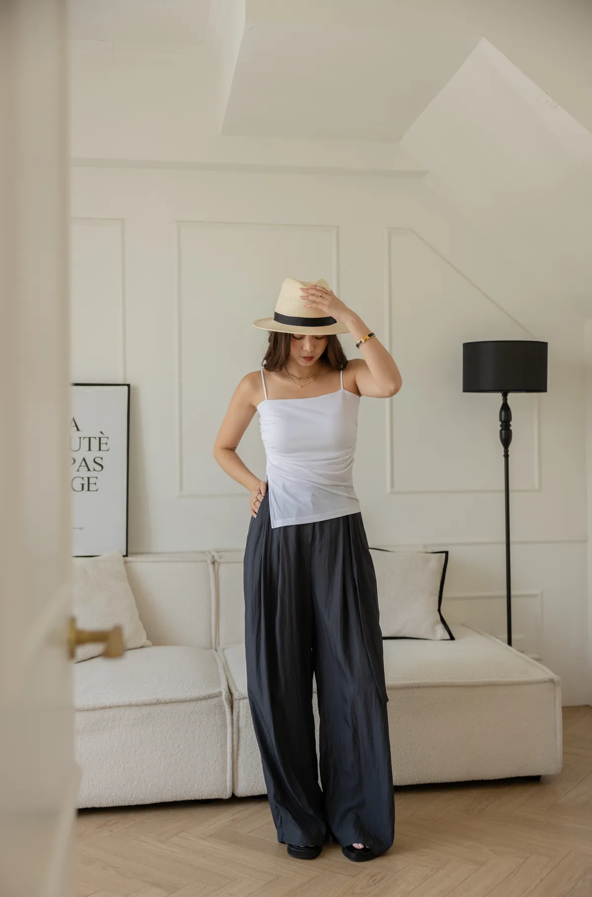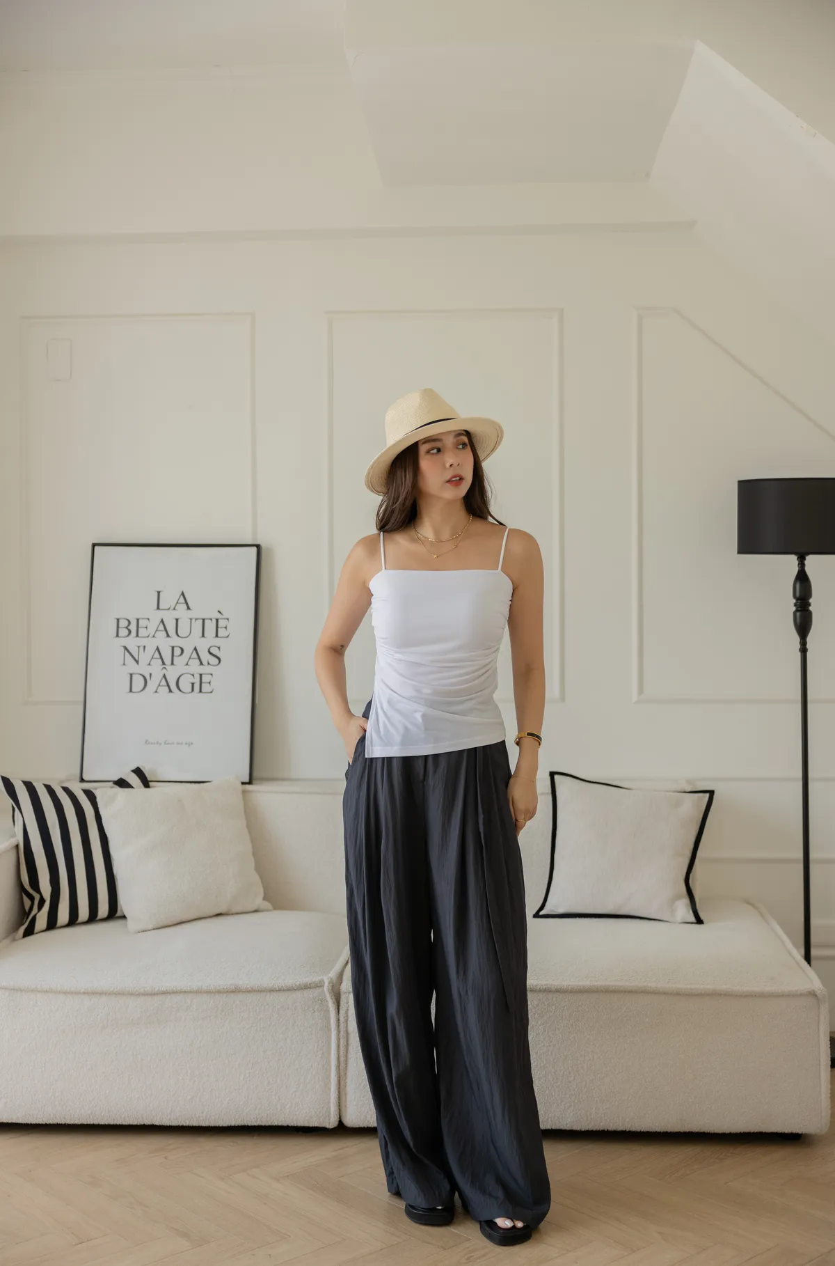 高級剪裁摺線修飾涼感落地舒服腰帶寬褲(深灰藍)