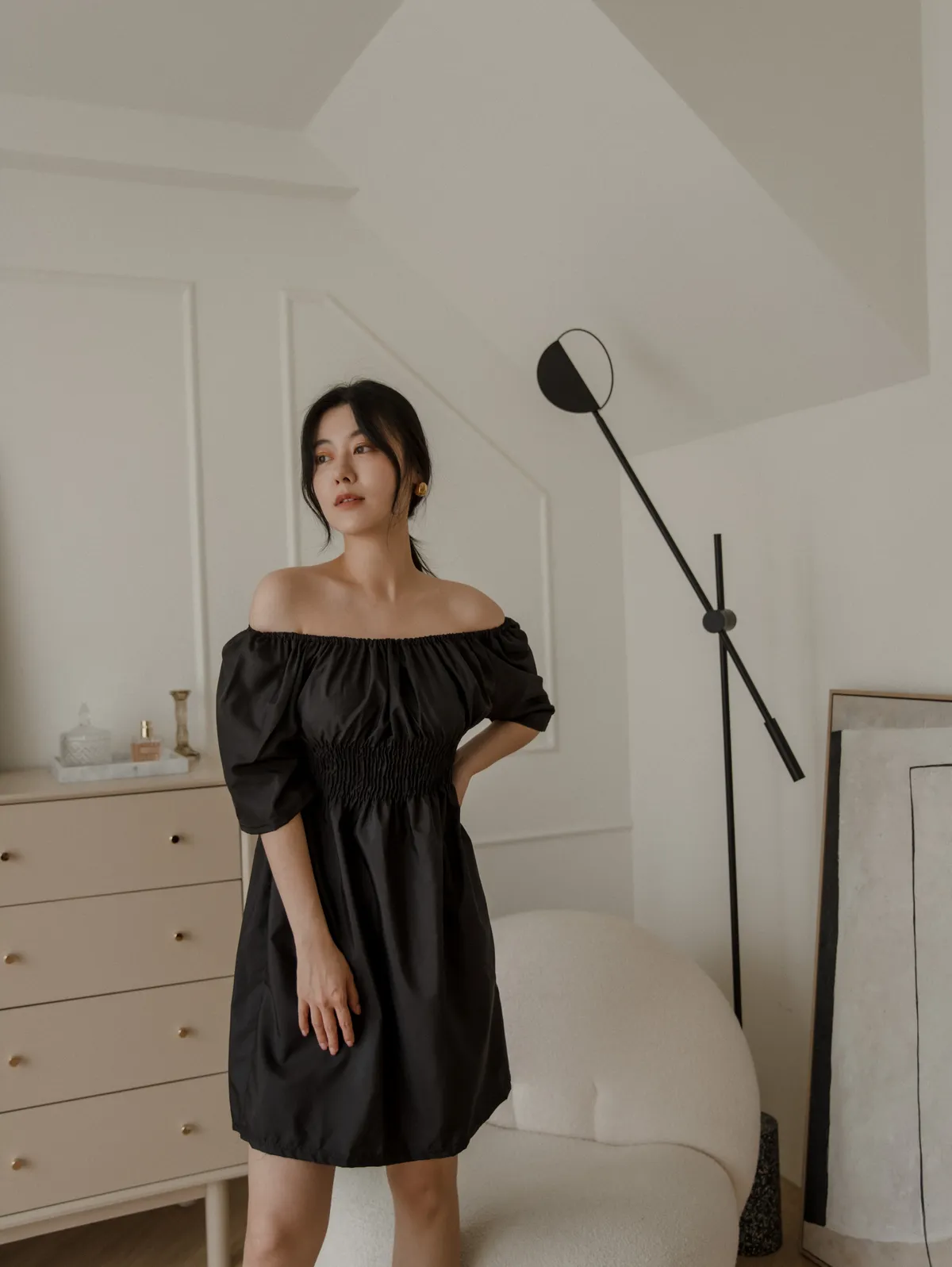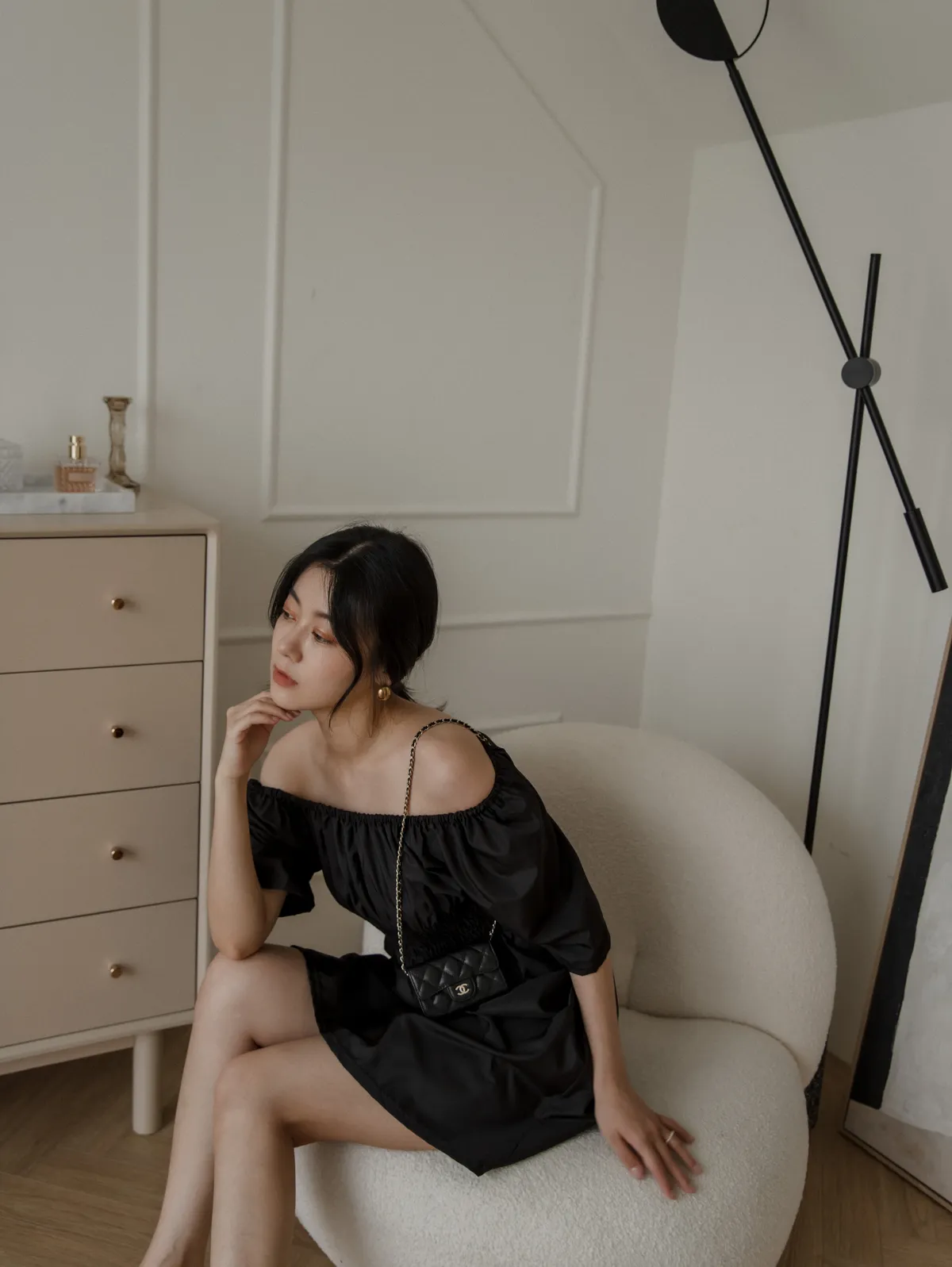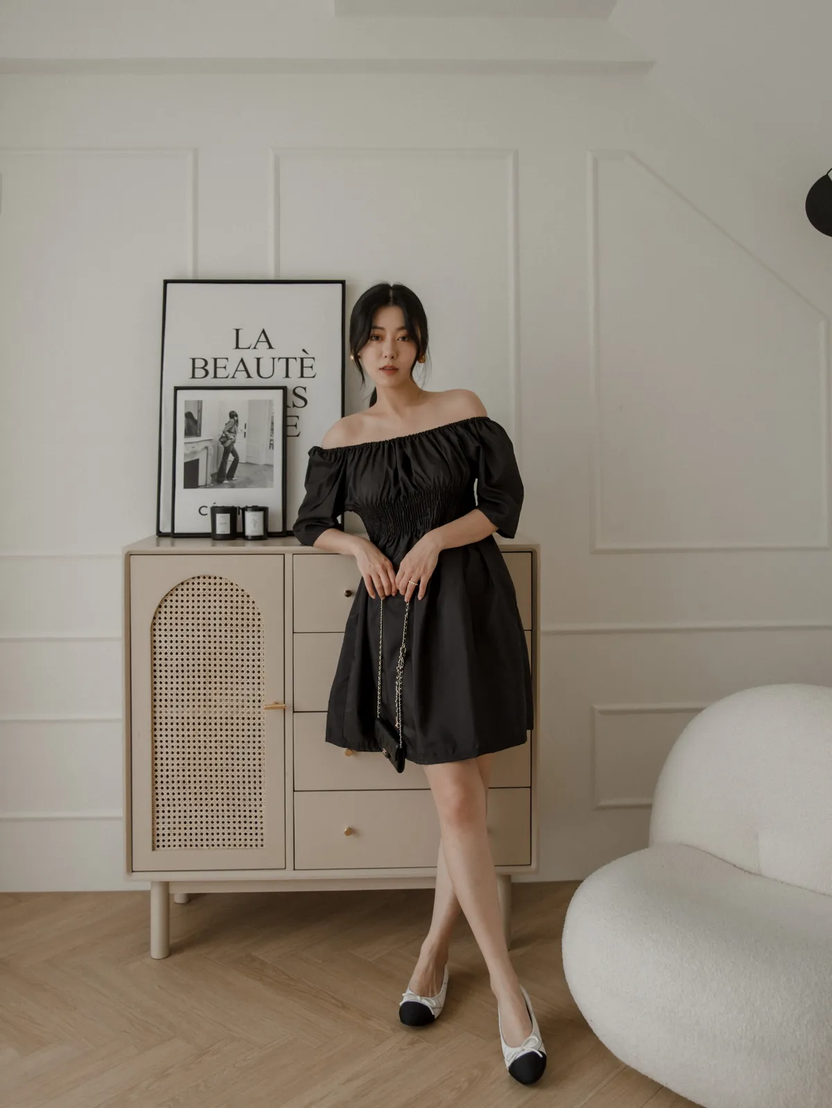 氣質千金小姐姐露肩彈性A字洋裝(黑)