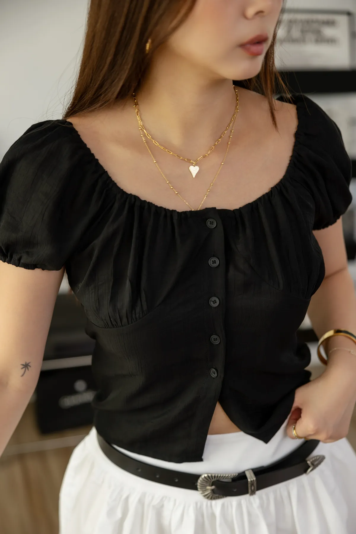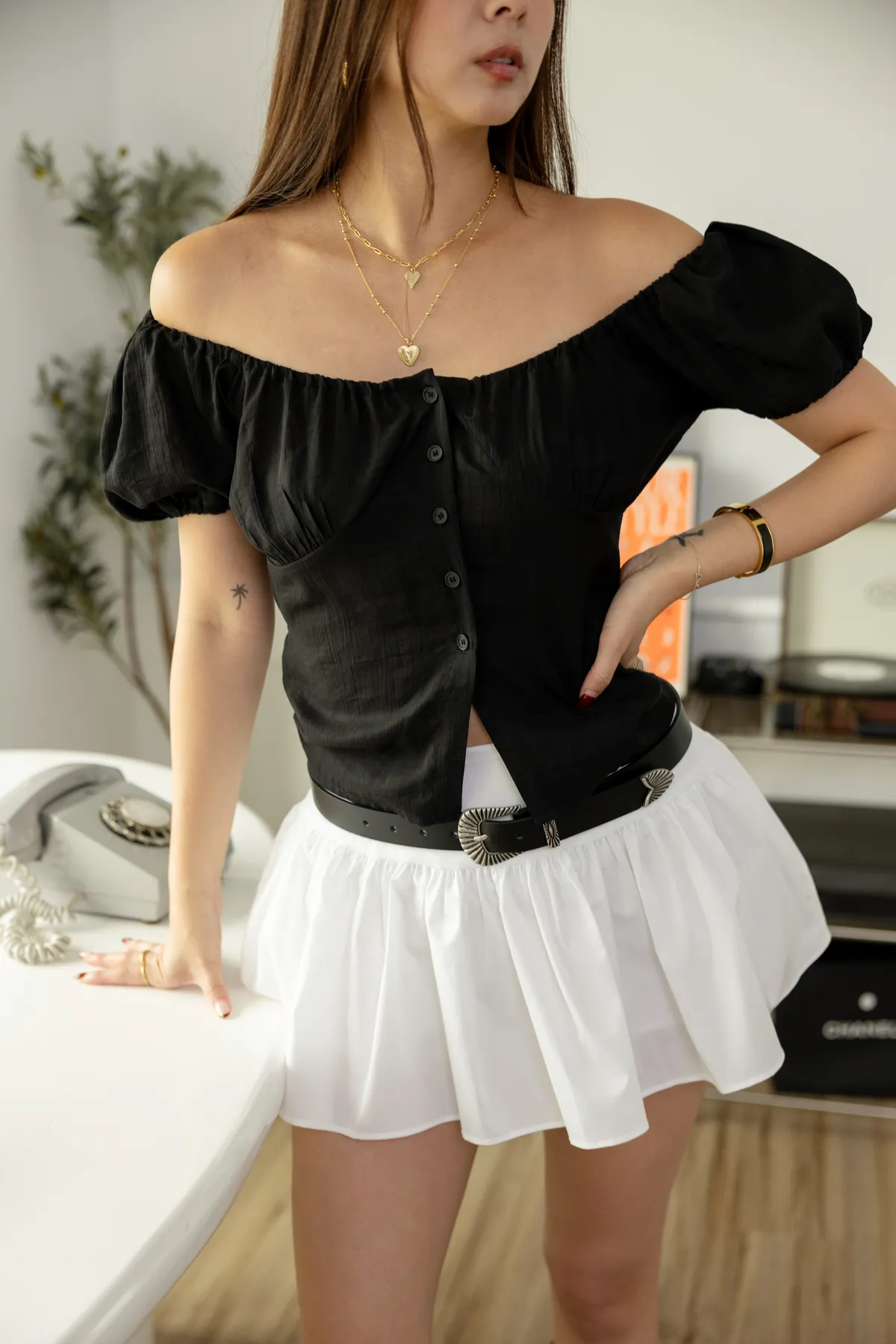 澎澎袖露肩扣子透膚涼感上衣(黑)