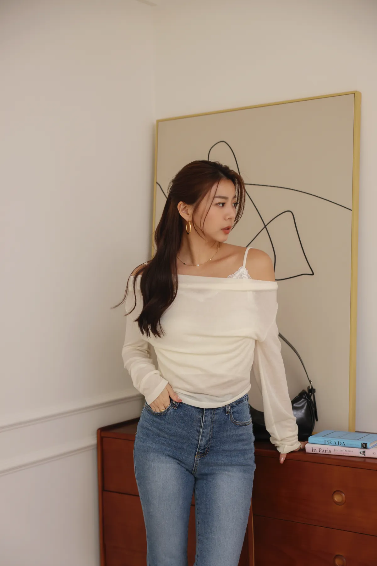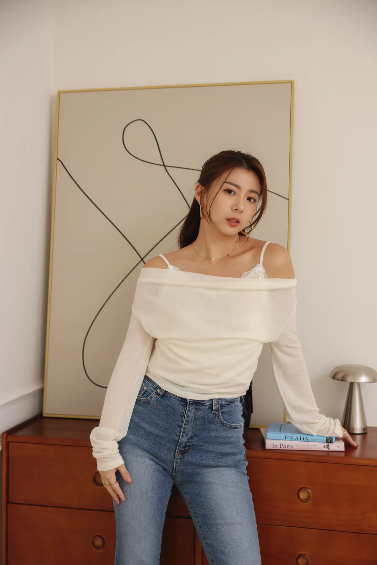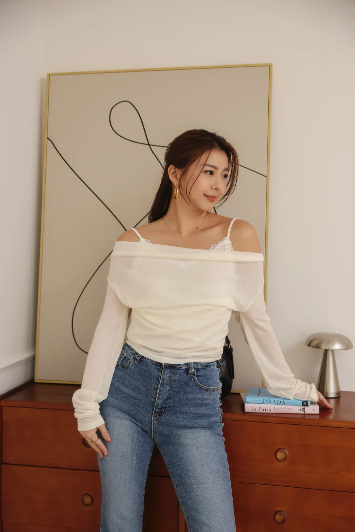假兩件細肩帶蕾絲露肩上衣(杏)