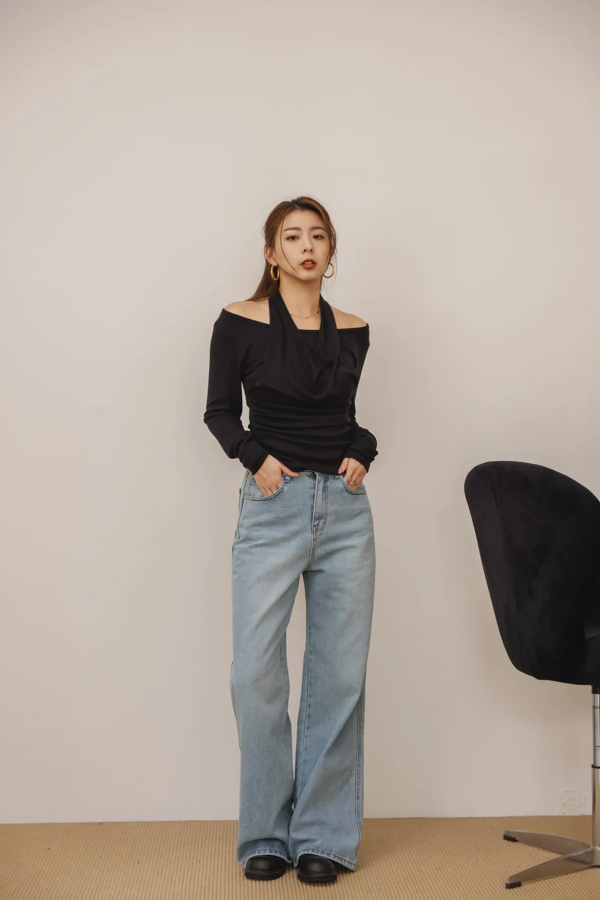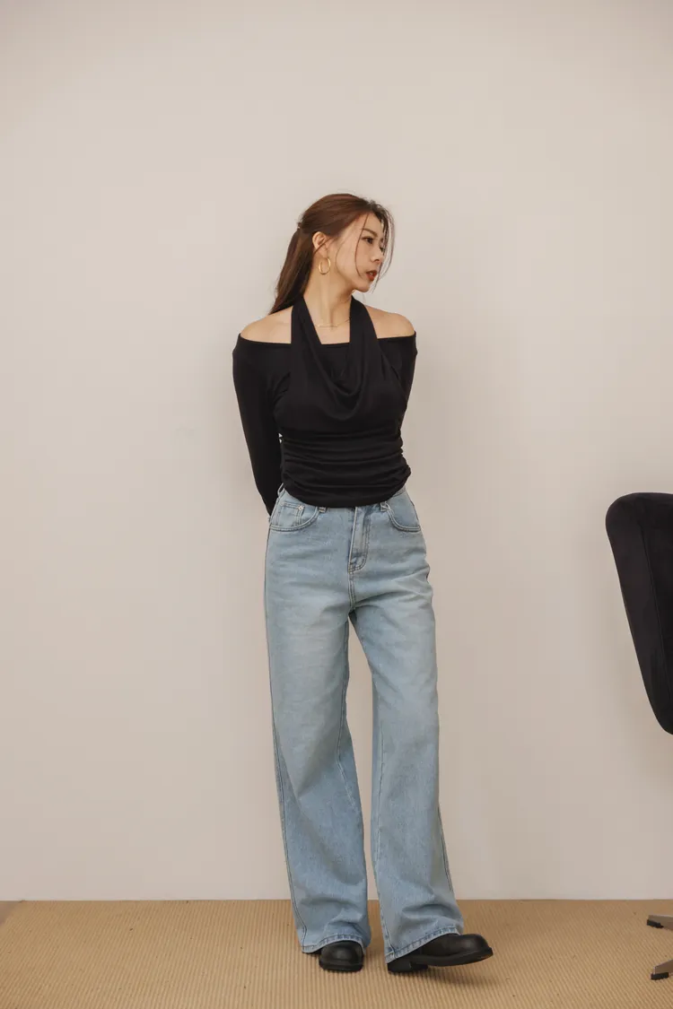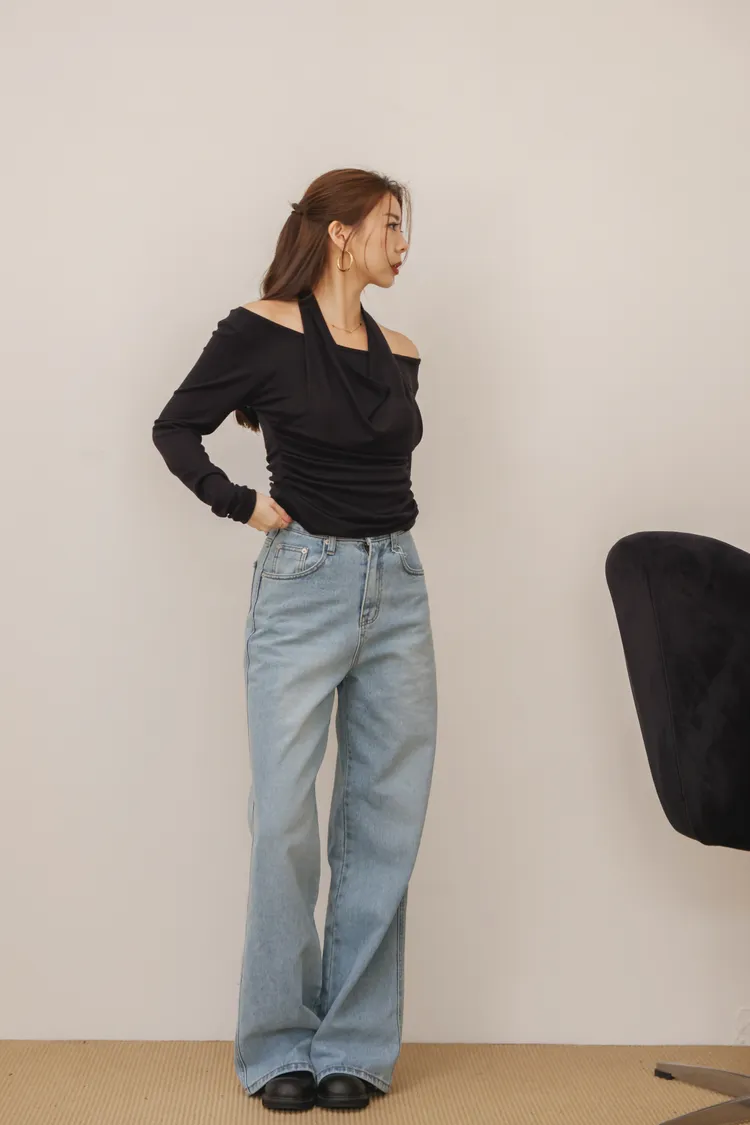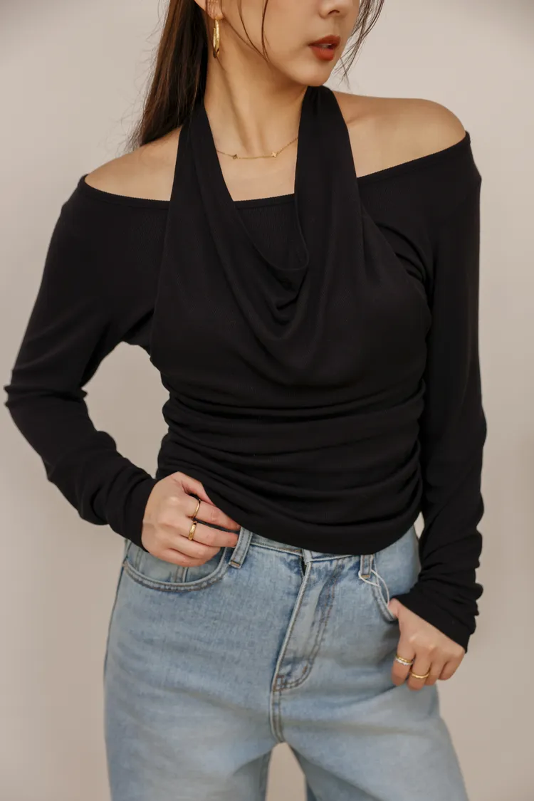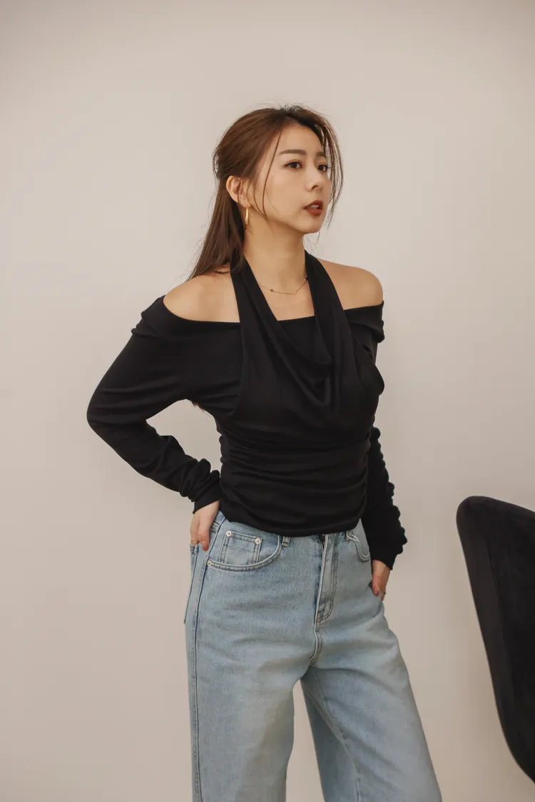 時髦歐膩繞脖露肩假兩件上衣(黑)