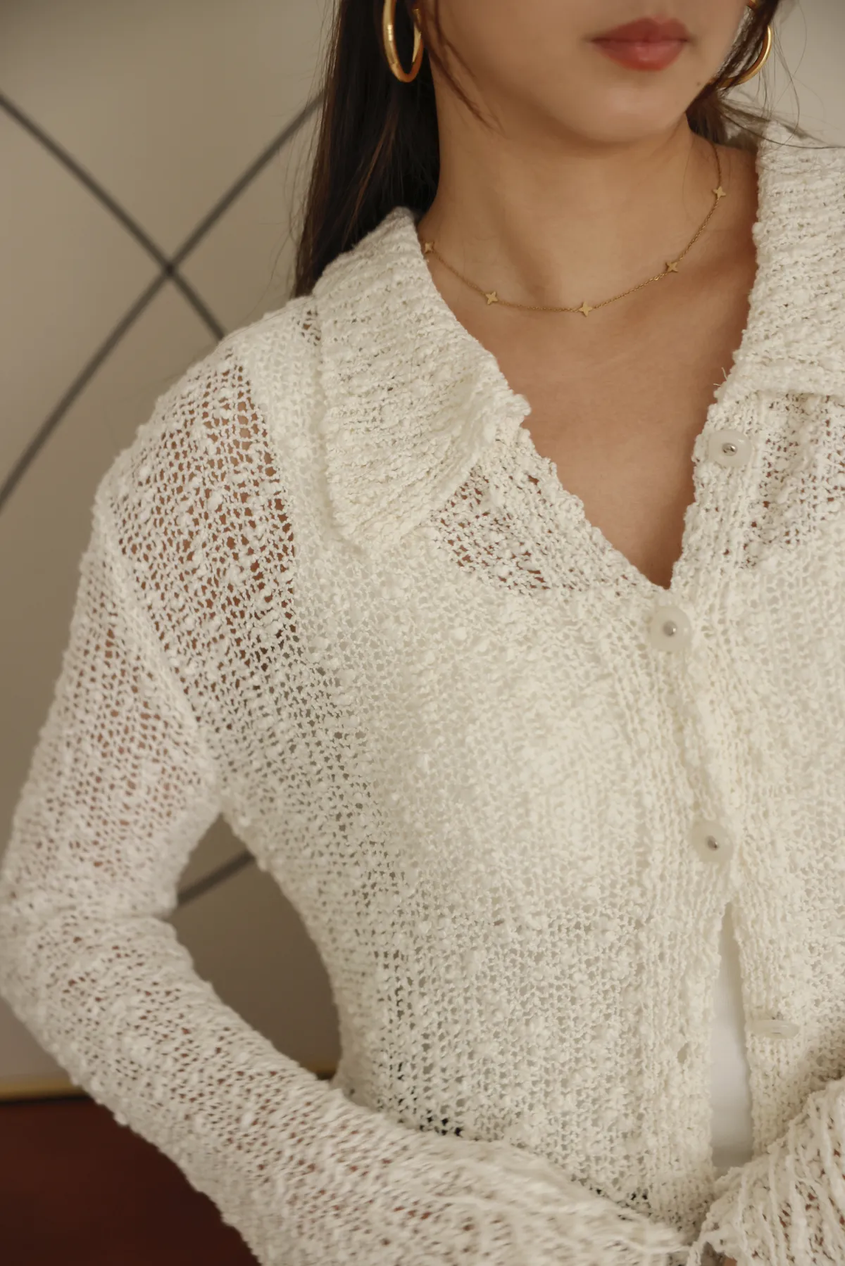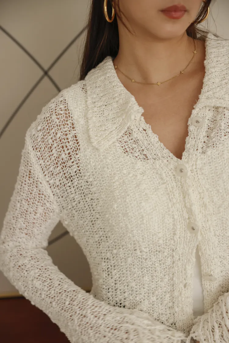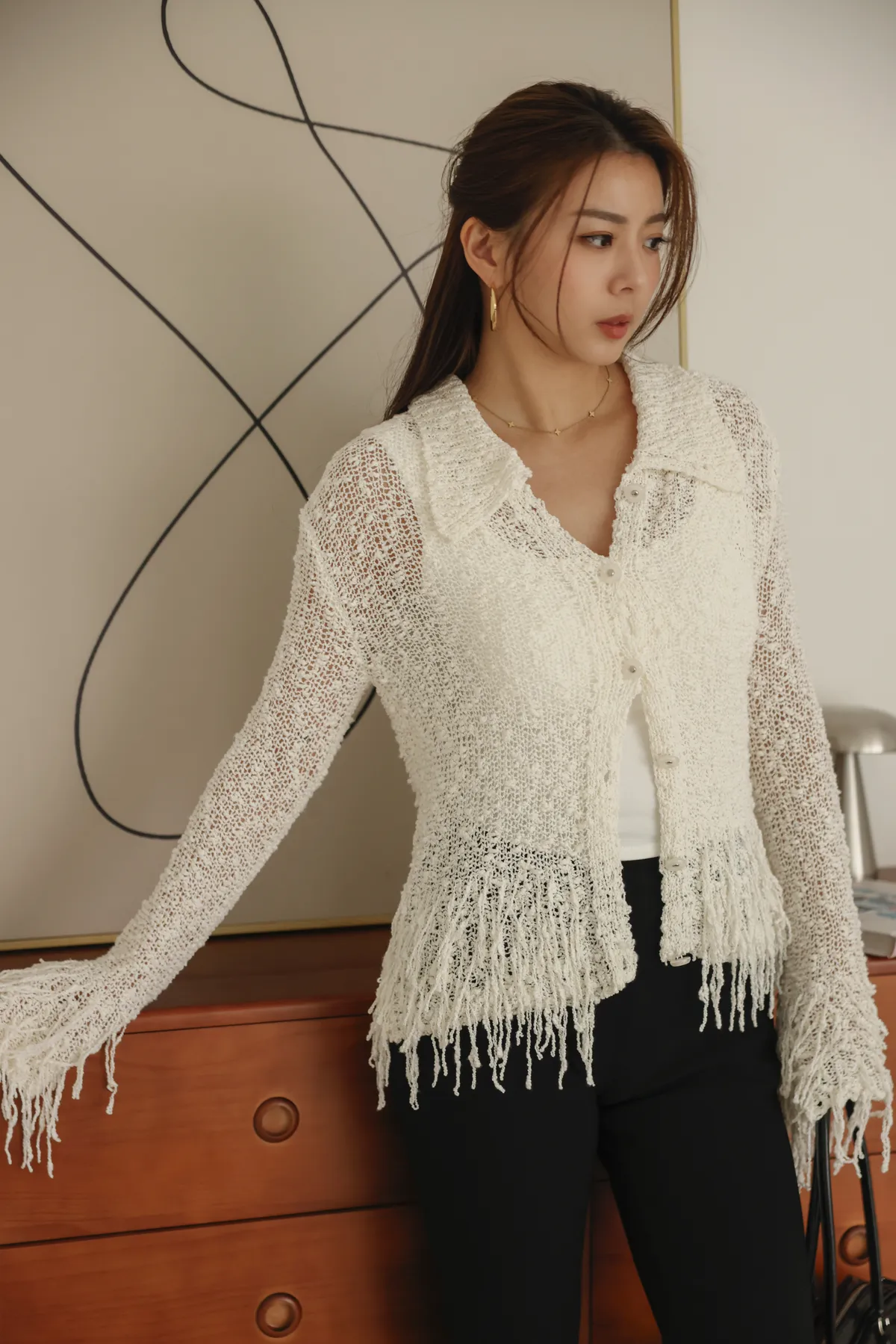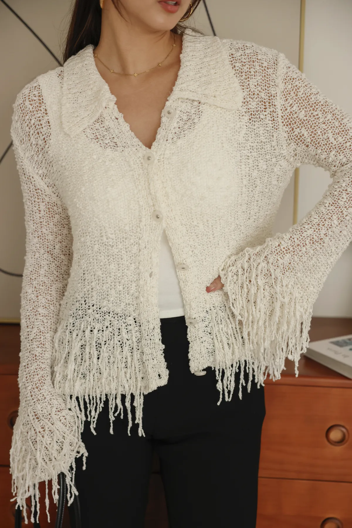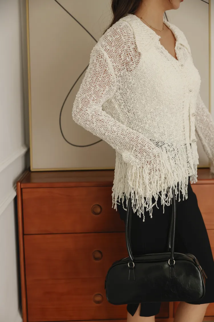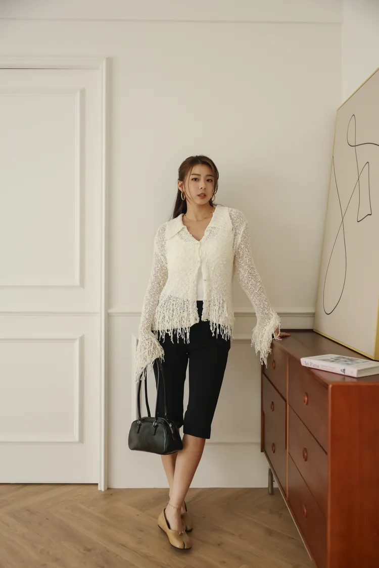 流蘇邊設計感排扣薄針織外套(米白)