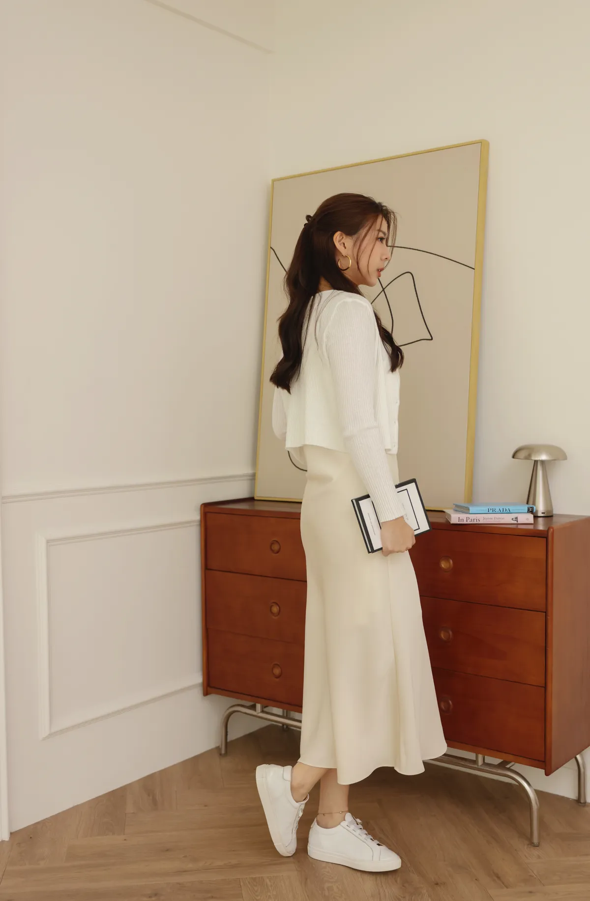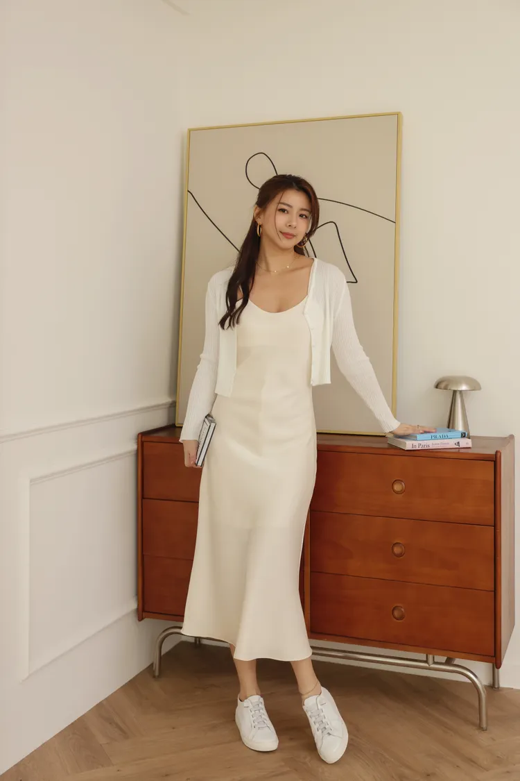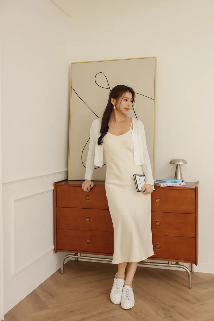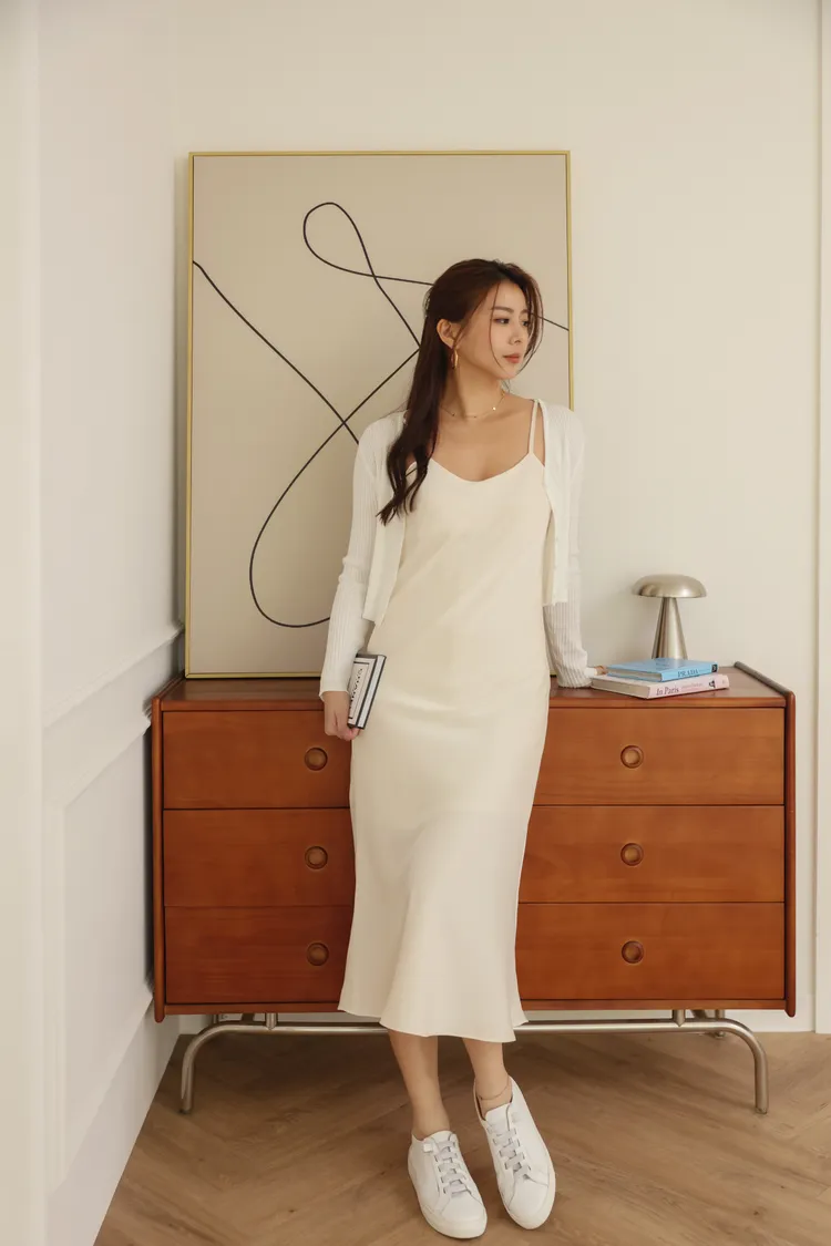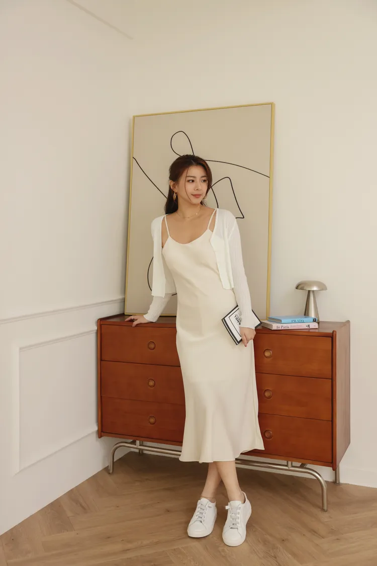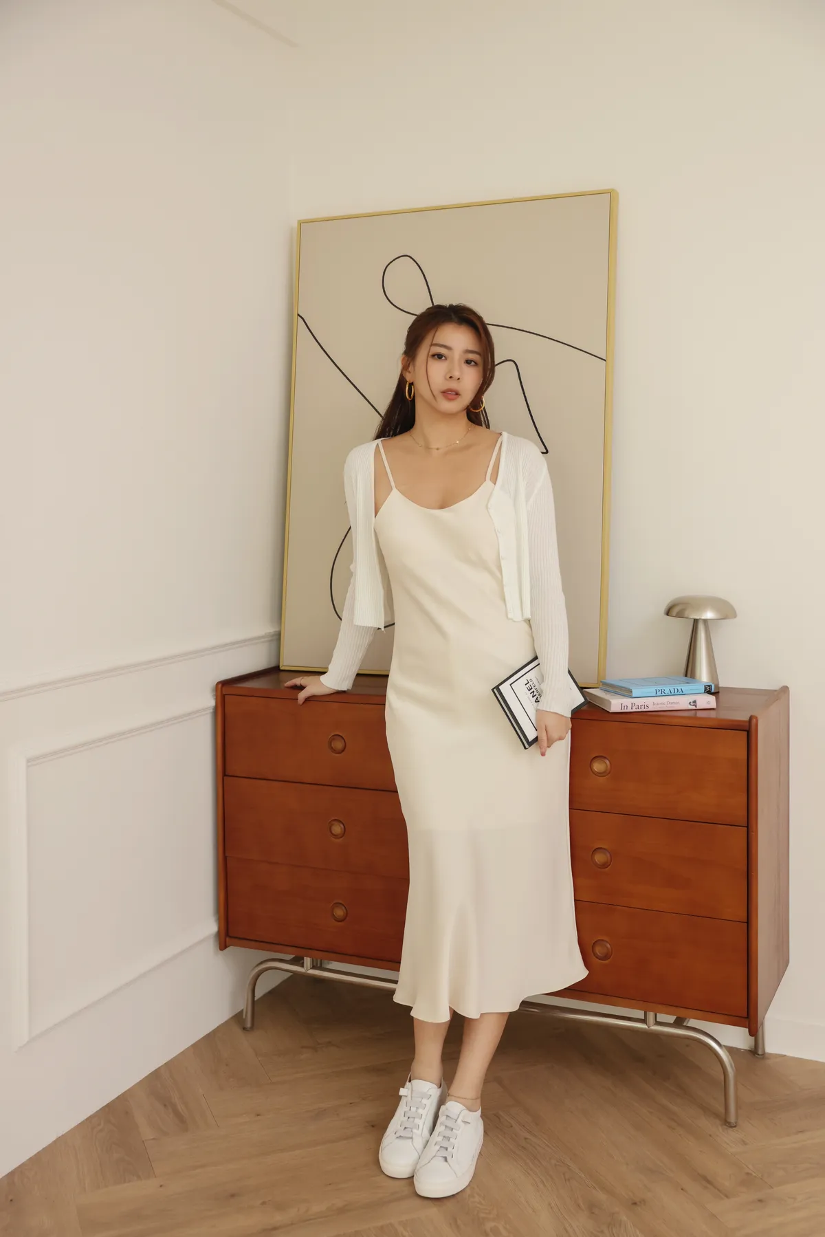 仙氣破表細肩帶緞面傘狀洋裝(米白)