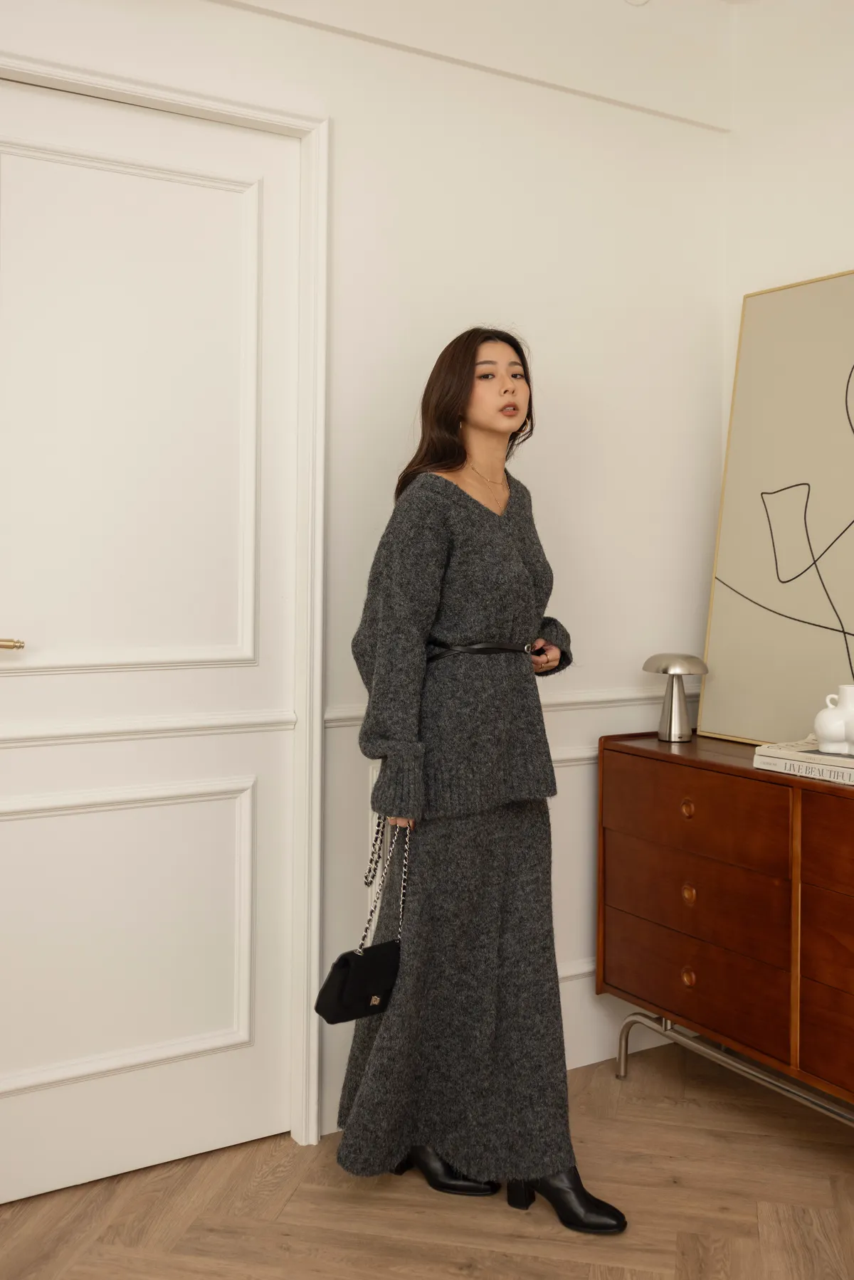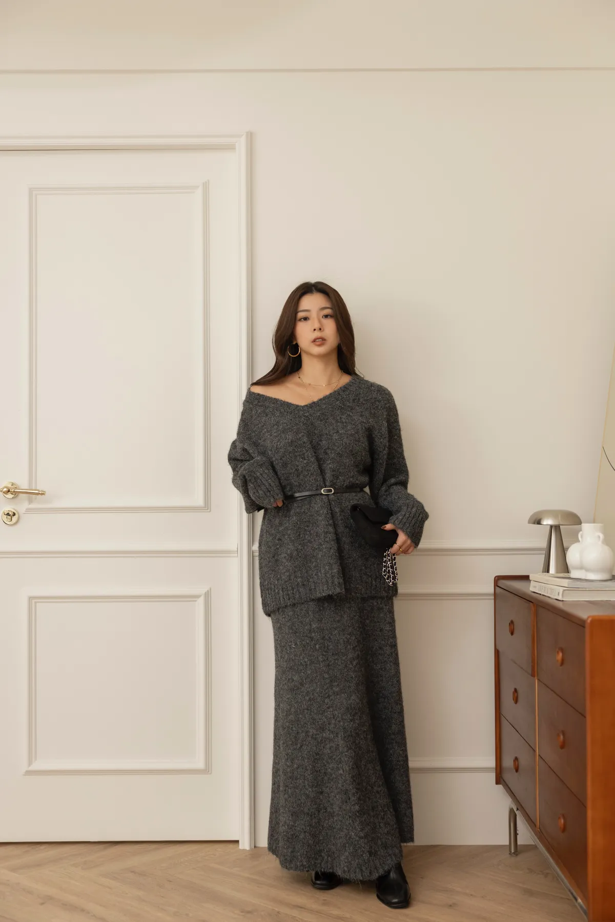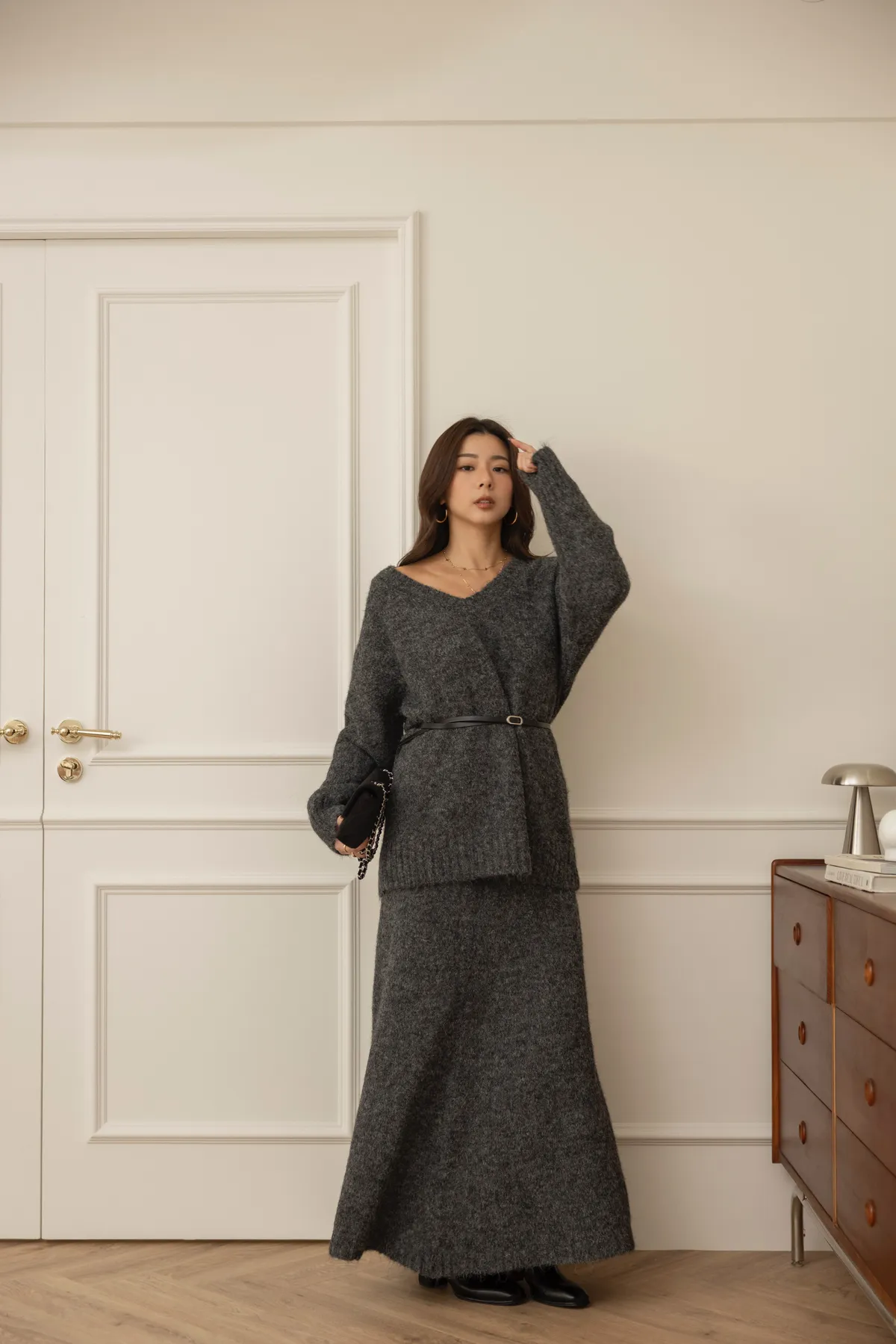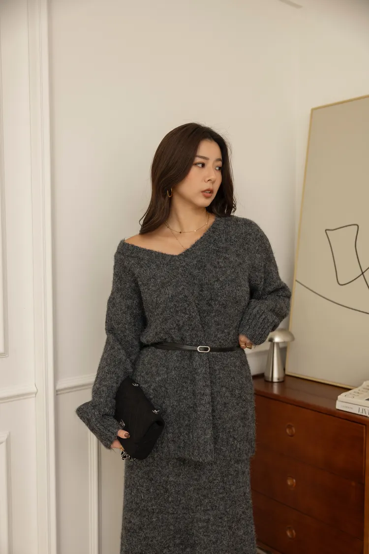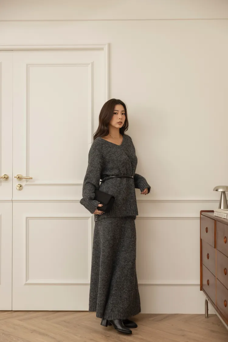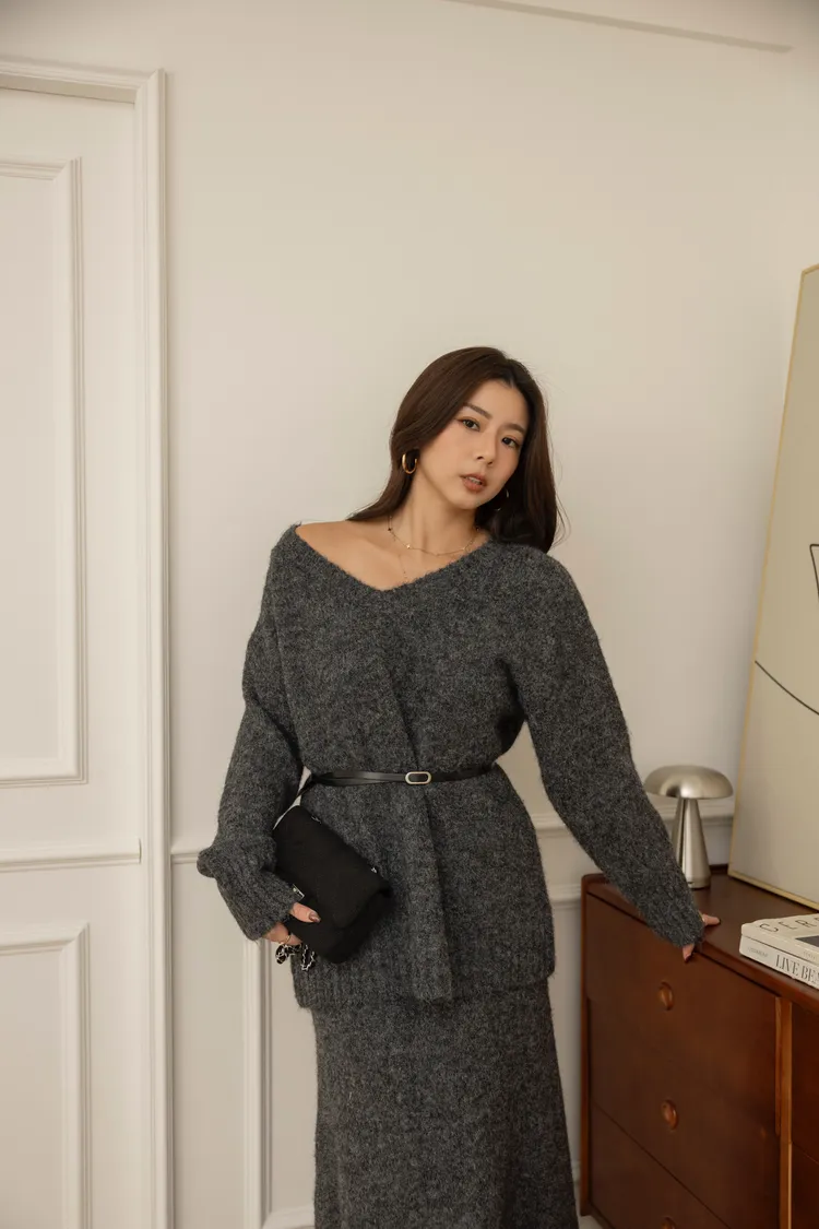 輕量親膚V領針織長版針織+彈性長裙set(深灰)
