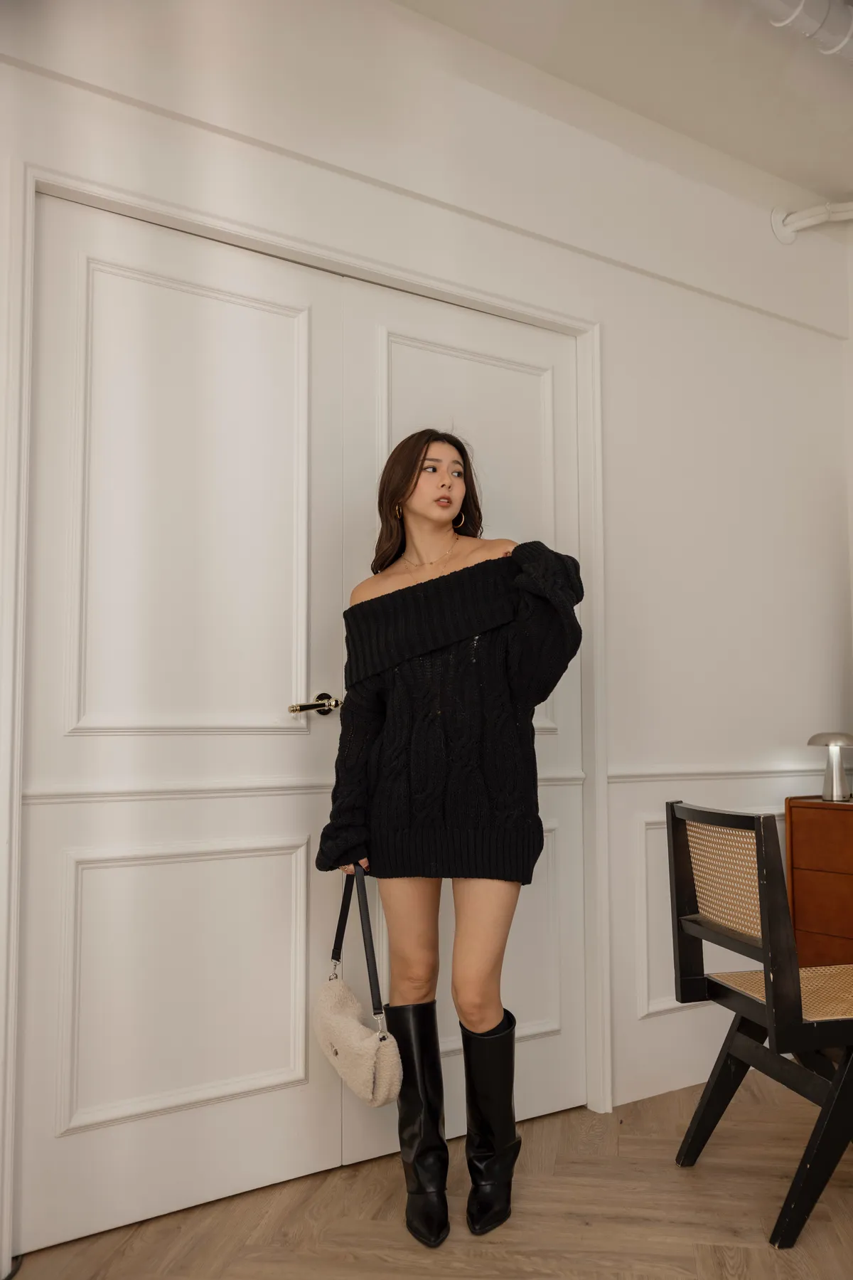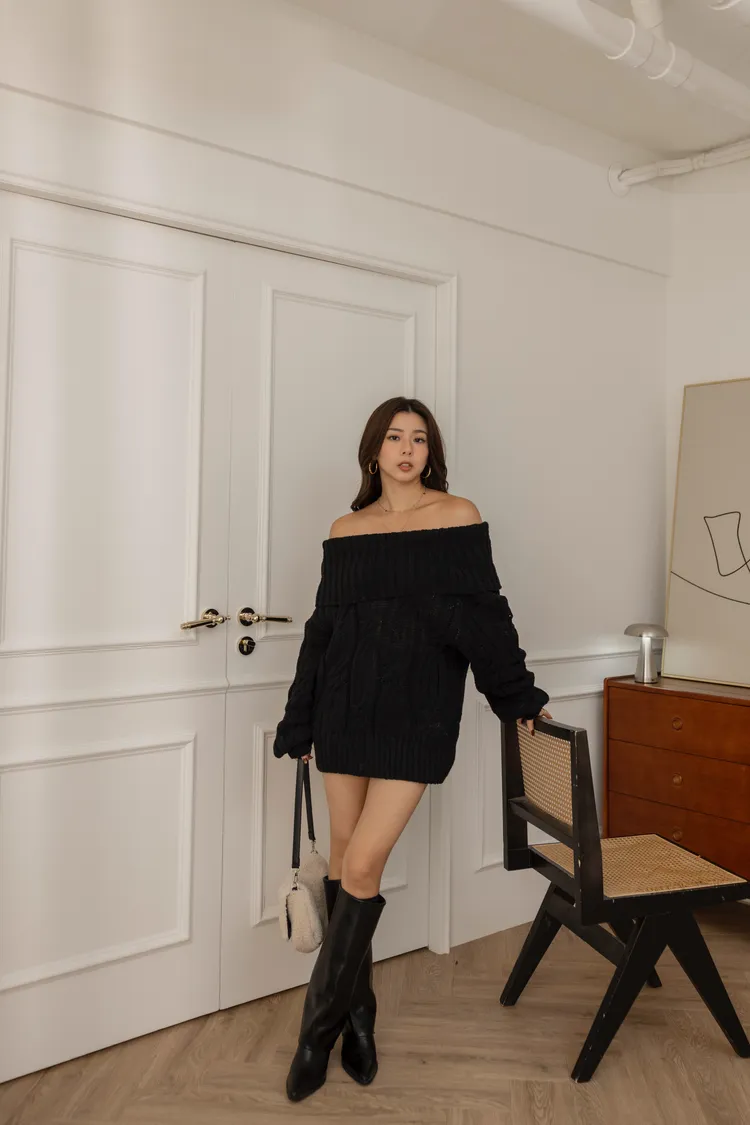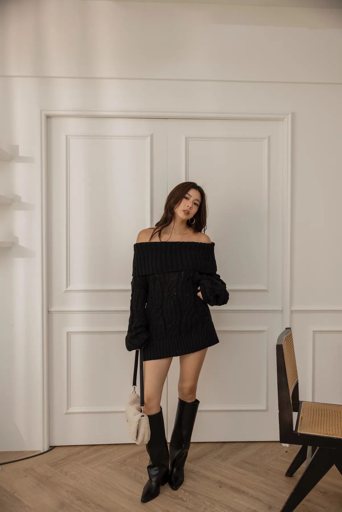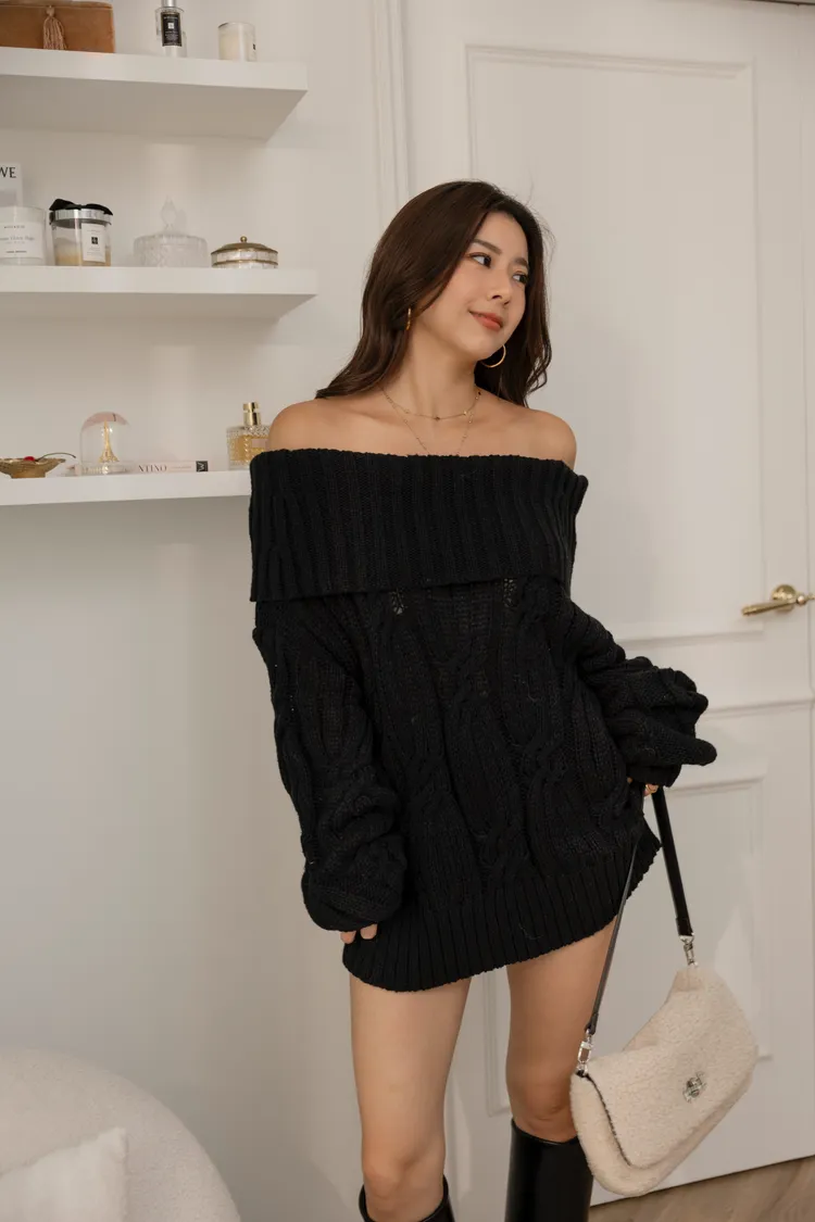 辣姊姊一字領露肩麻花紋磅數長版針織(黑)