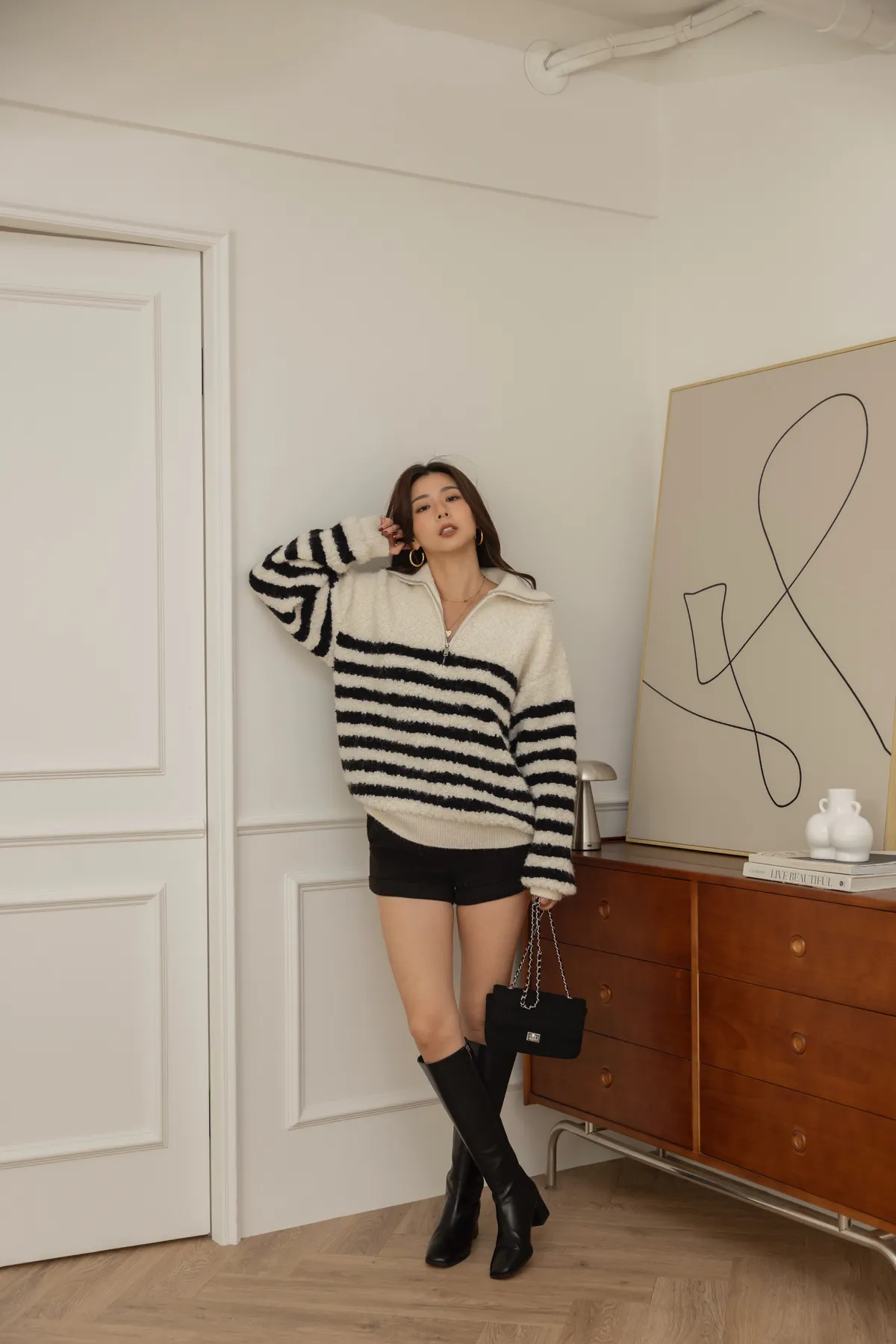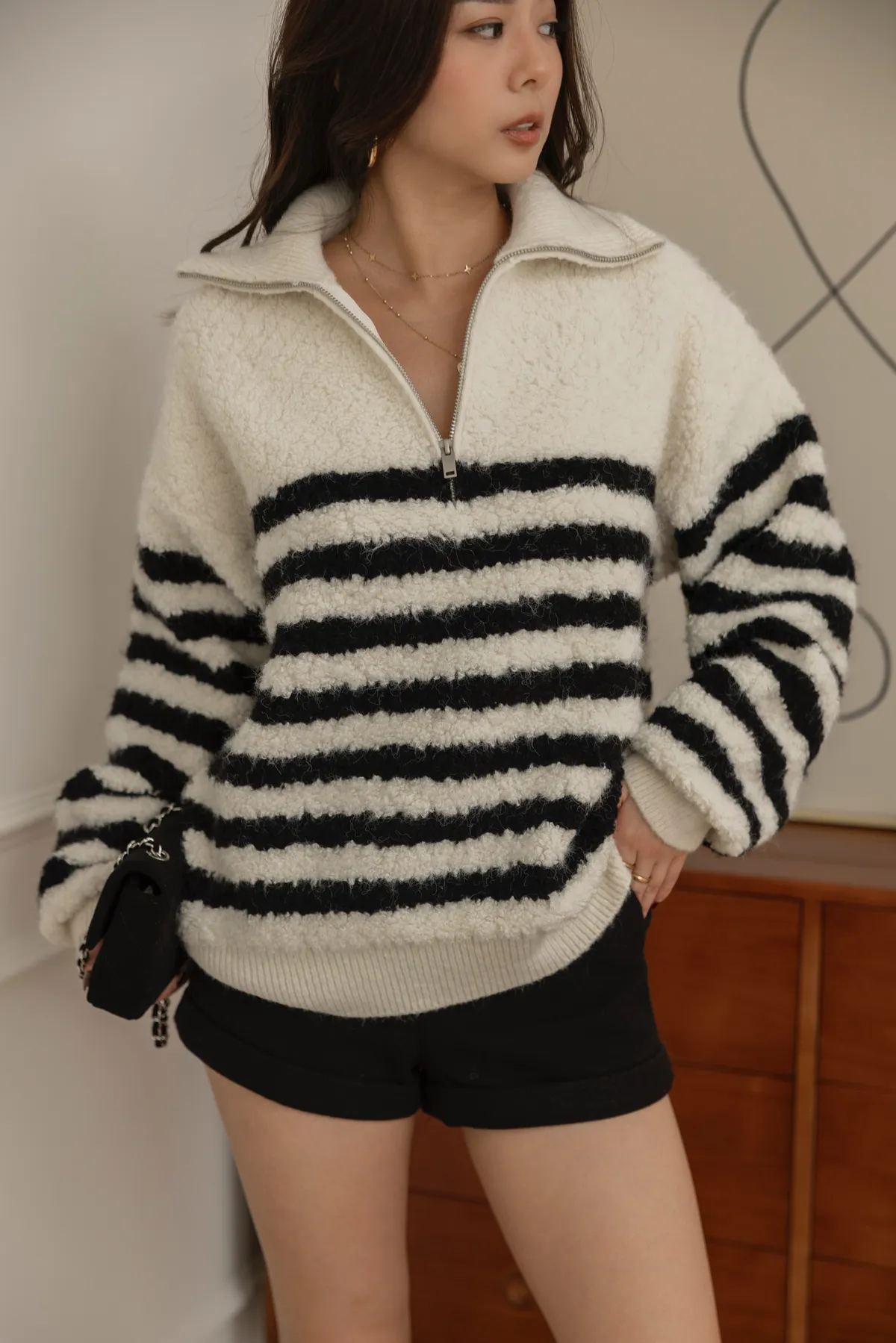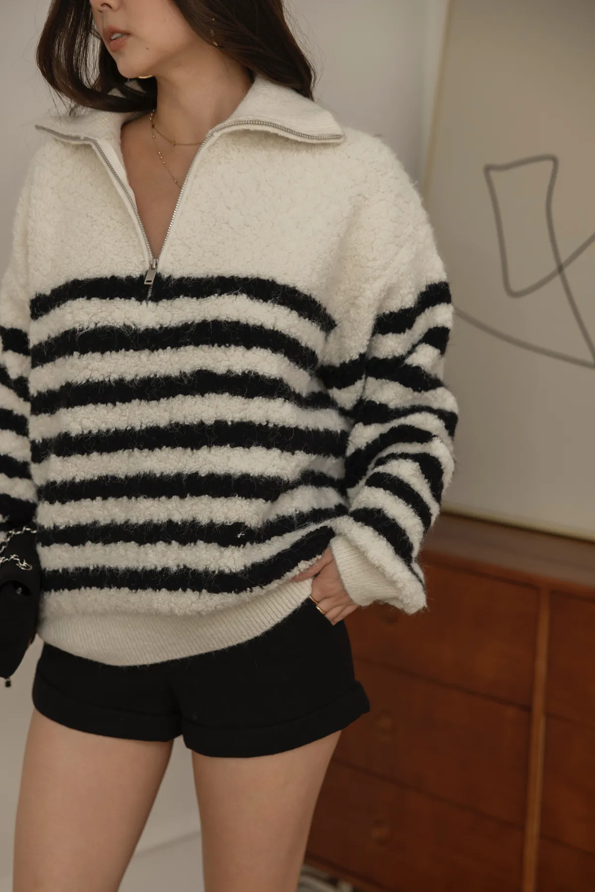 羔羊毛柔軟翻領半拉鏈條紋上衣(白)