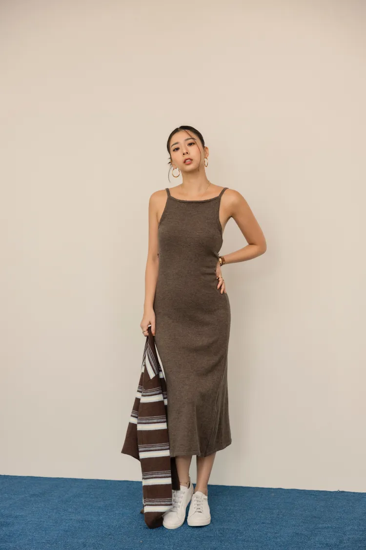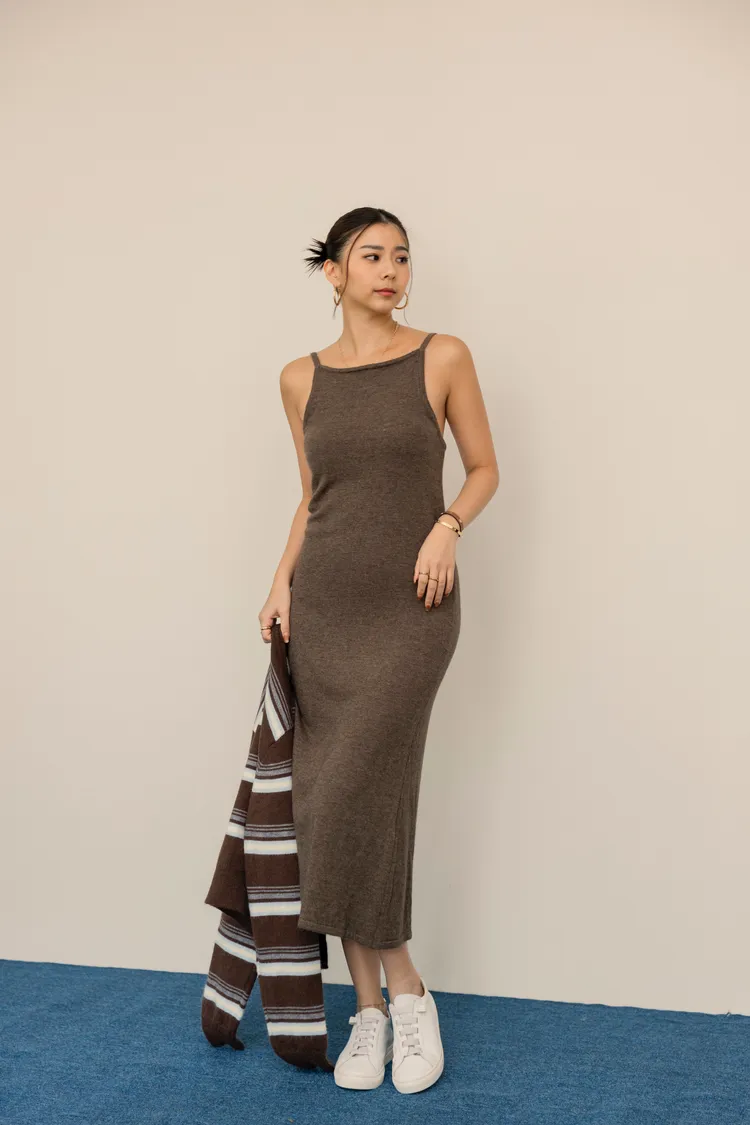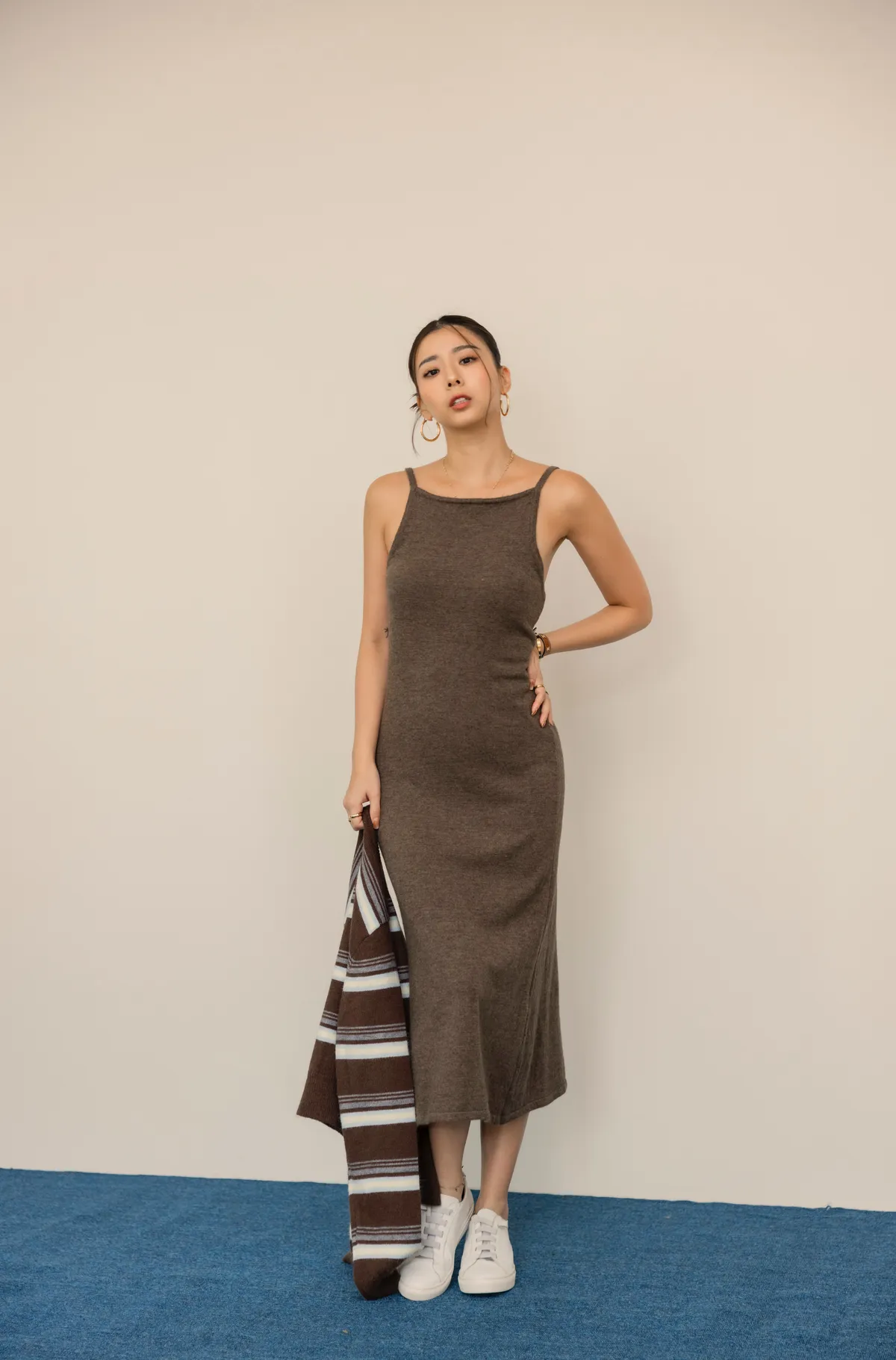 好身材親膚彈性針織削肩露背長洋裝(咖)