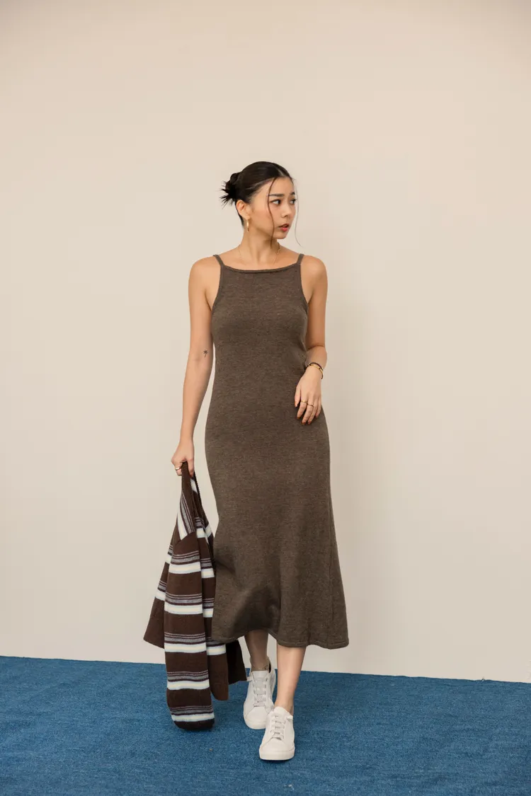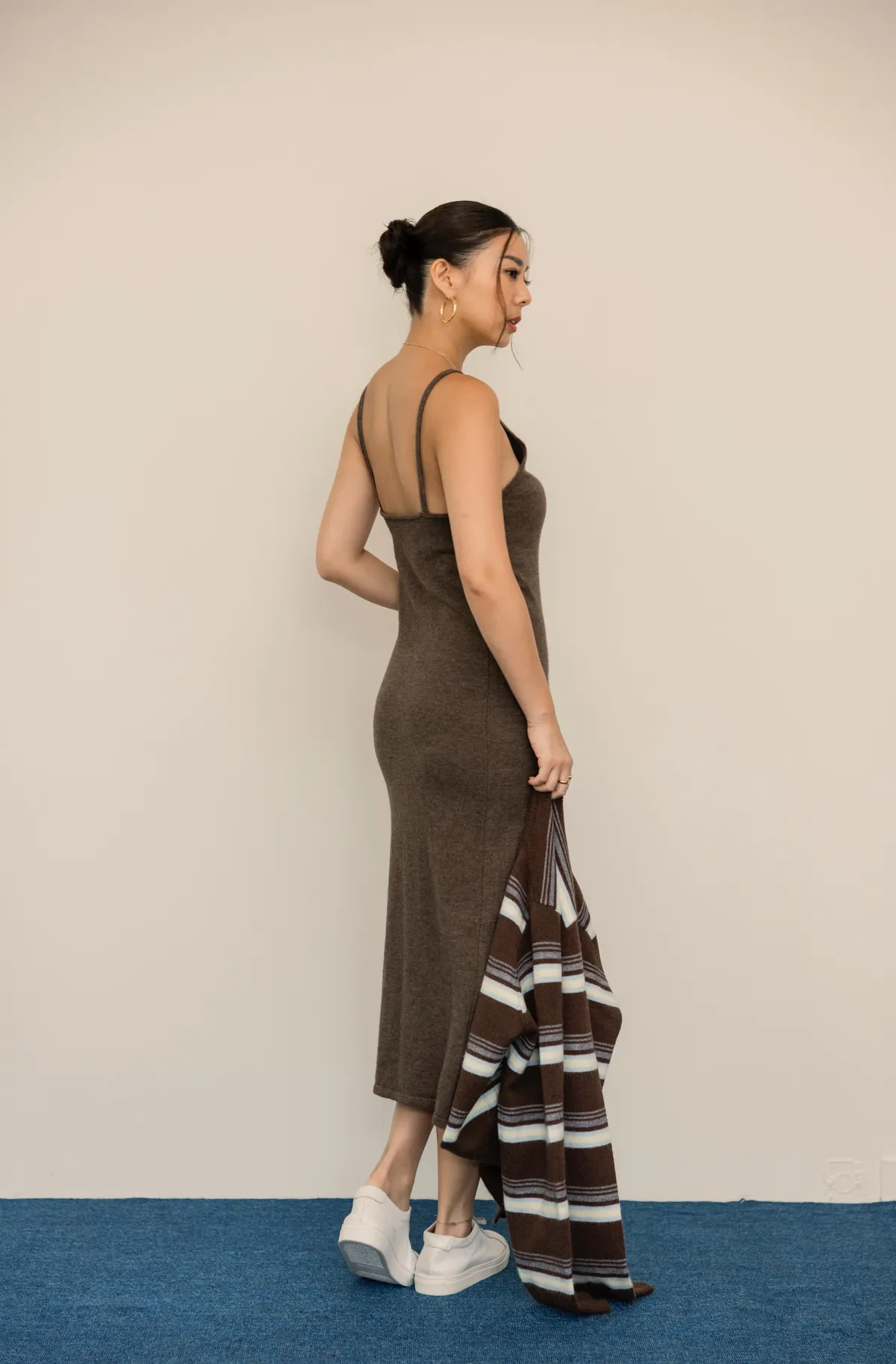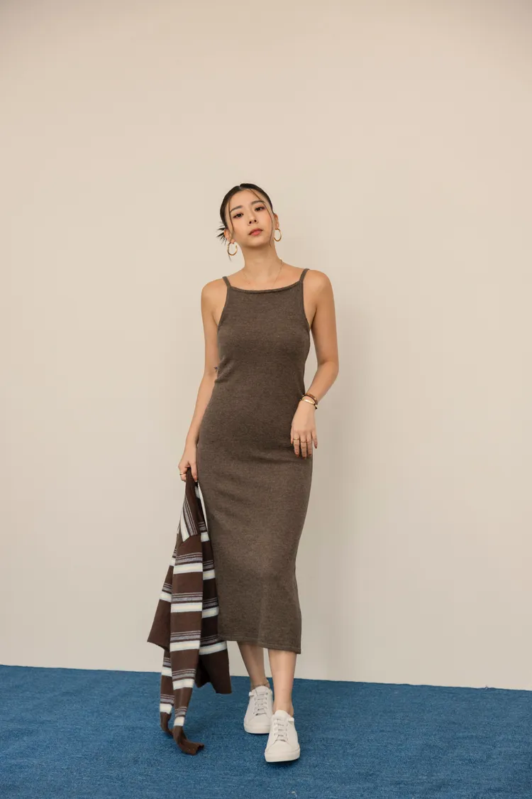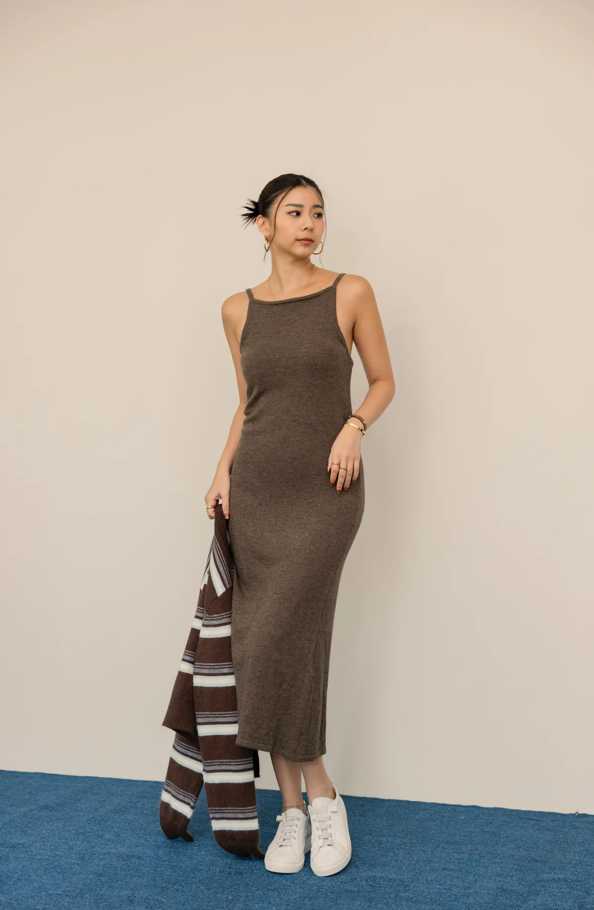 好身材親膚彈性針織削肩露背長洋裝(咖)