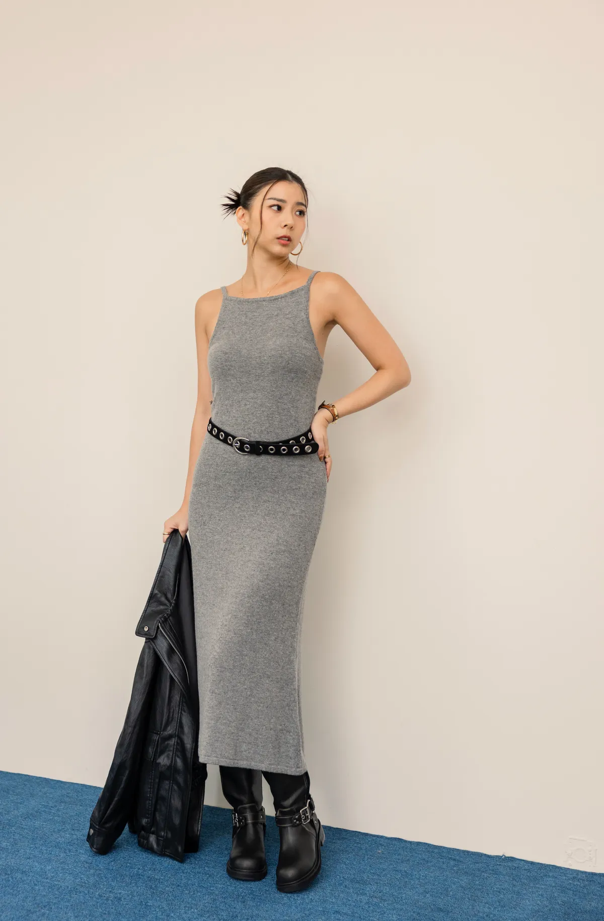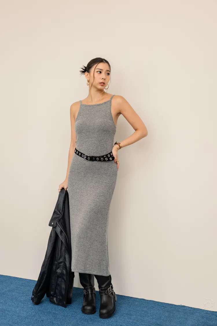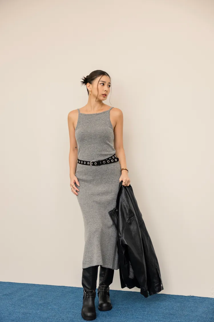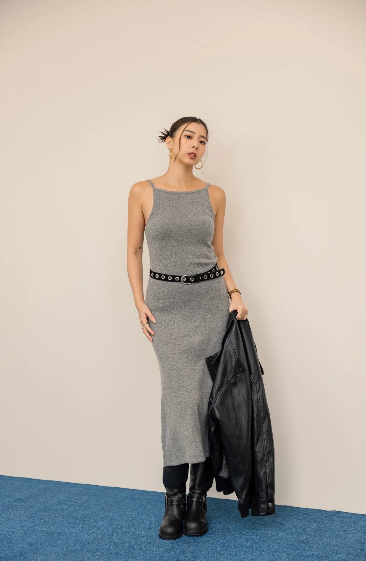 好身材親膚彈性針織削肩露背長洋裝(灰)