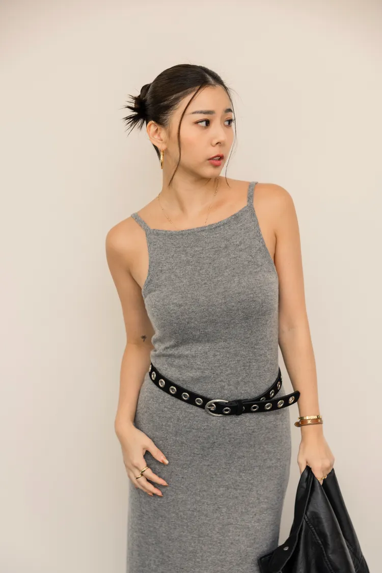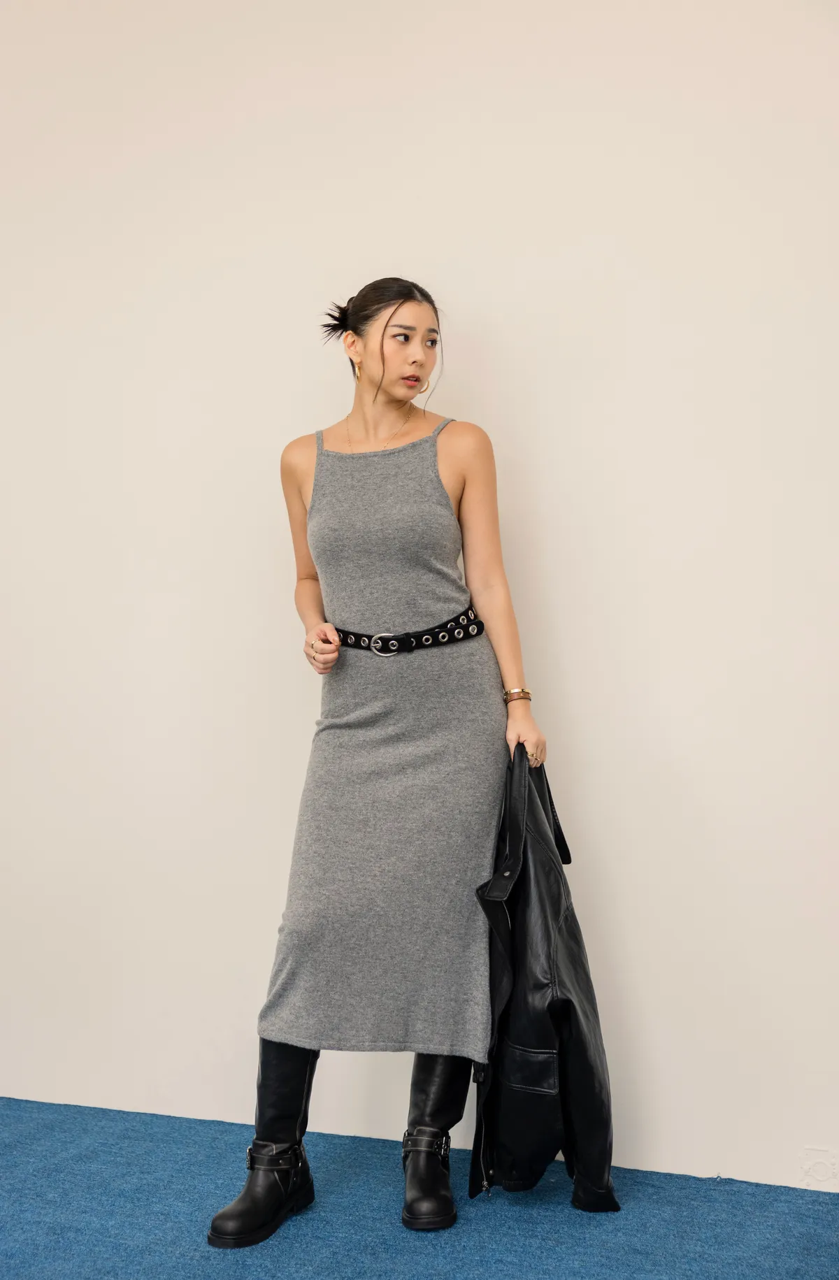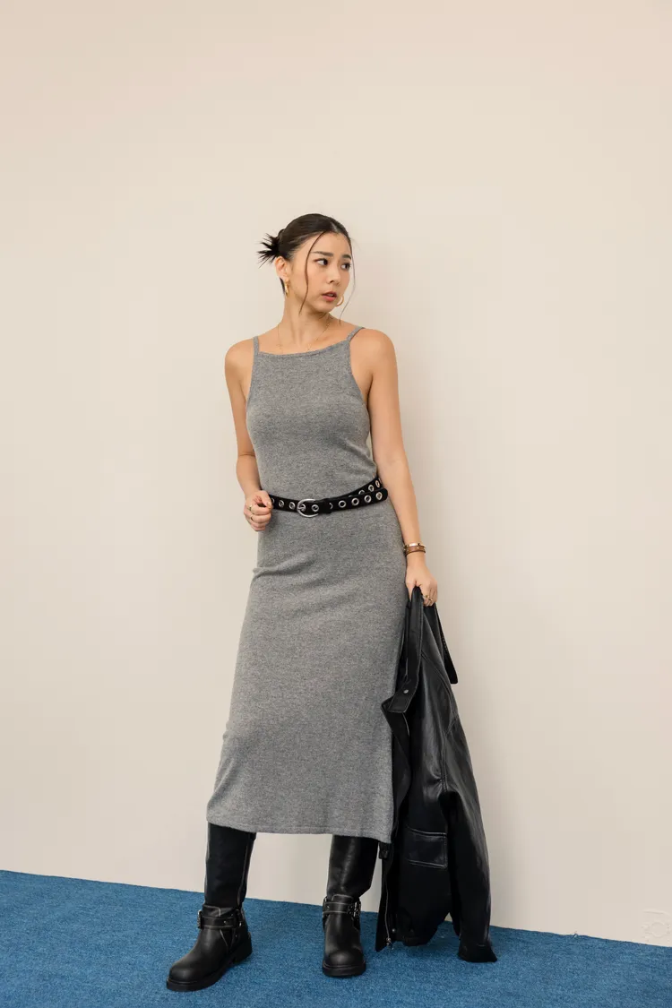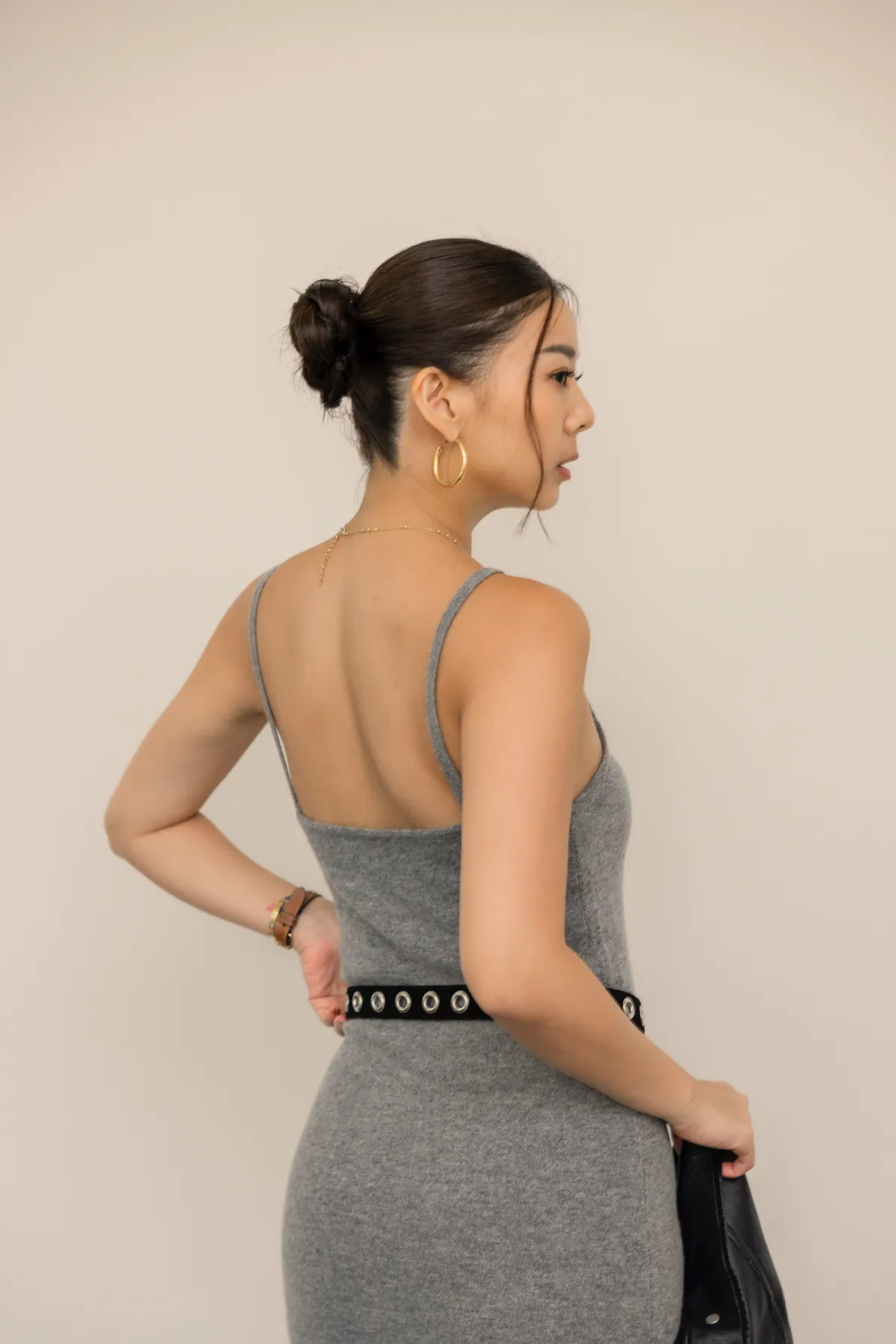 好身材親膚彈性針織削肩露背長洋裝(灰)